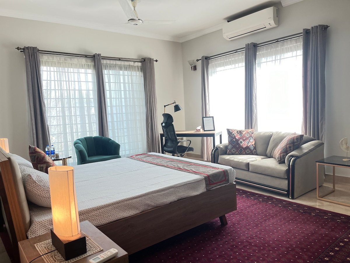 Experience luxury living in the heart of Islamabad’s posh area. Wake up to elegantly styled interiors, private patio, and enjoy high-speed 50 Mbps Wi-Fi, workstation, and 180+ HD channels, and equipped with 24/7 dehumidifier. You will right by the jogging track and just minutes to 50+ eateries and 30+ retail brands. Self-check-in, optional meals and airport transfers add a touch of ease. Traveling with little ones? A cozy toddler cot is ready for you. Your perfect luxury retreat awaits