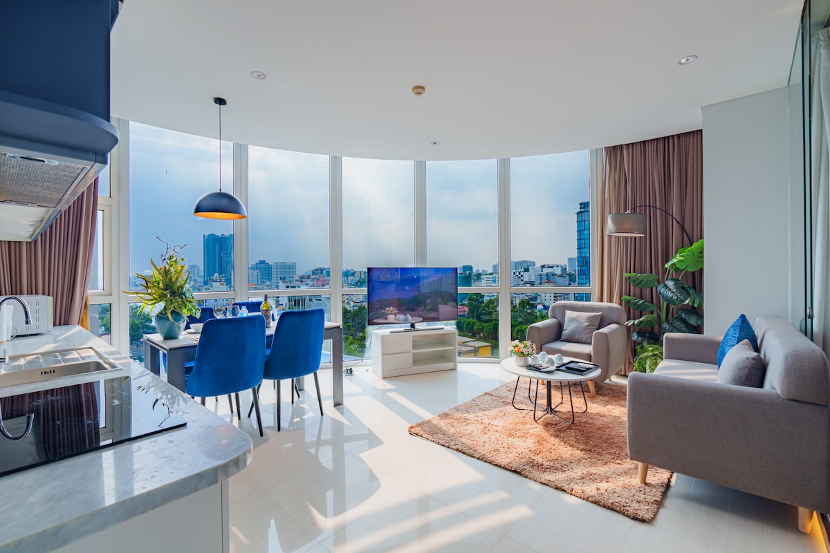 Go back to the Retrofuture with our vibrant & fun space-age apartment! This quiet 50sqm unit is filled with cool design touches, custom furniture, and amazing amenities. The room features: -Spacious living room -Work desk and chair -Huge bathroom+bathtub -Extensive coffee+tea bar -300 Mbps wifi We are in the peaceful Tan Dinh neighborhood, near many cafes and restaurants, and close to the famous Pink Church. Relax on the ground floor with a yummy matcha or coffee at the Moment Café.