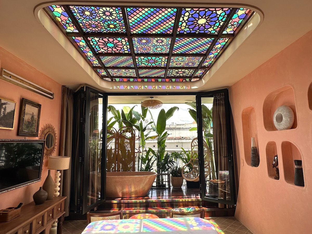 As you step inside this stunning house , you'll be greeted by a spacious and airy living area with ample natural light streaming in through a large special stained glass skylight in the heart of the living room. The open concept floor plan seamlessly flows from the beautiful open- space bathtub through bed-living room into a spacious kitchen with floor-to-ceiling glass doors that open onto the garden. This place is just an luxurious greenery oasis and perfect choice for travelers to unwind