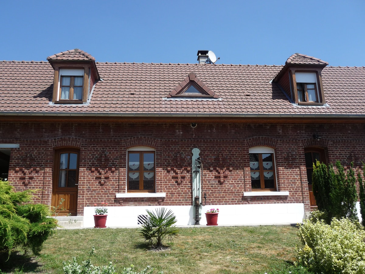Maison ancienne bâtisse rénovée entièrement. Équipée idéale famille. À 15 km d' Amiens capitale de Picardie, 1h des plages, Gare à proximité. 2 chambres : 1 lit de 2 personnes. La seconde 2 lits d'une personne. Salle de bain avec grande douche et équipements bébé (baignoire, tapis à langer) sur demande. 1 cuisine équipée tout confort (lave vaisselle, chaise haute ...) 1 salon avec canapé (jeux de société, télé, wifi) jardin clôturé, terrasse table, barbecue et parking privé. Maison enfants.