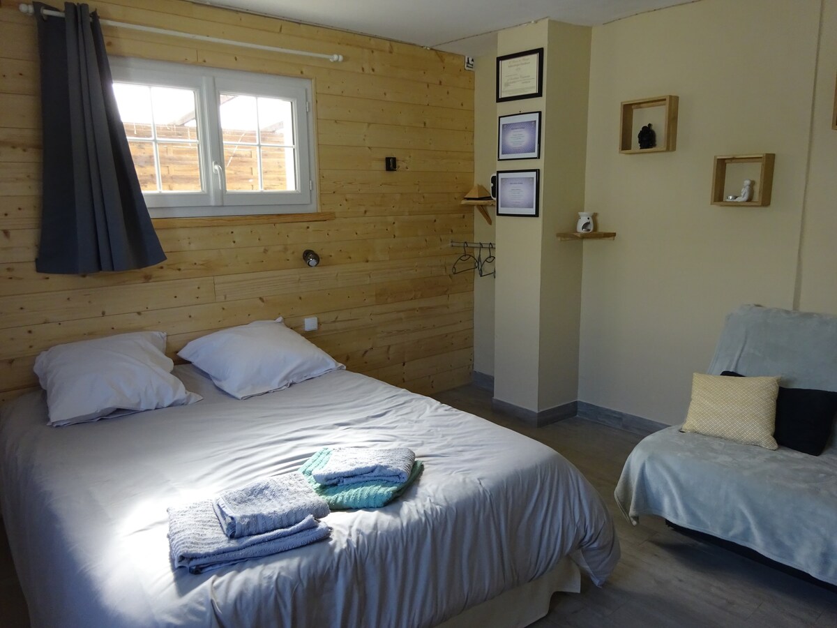 une chambre avec 1 lit (160x200) et 1 canapé lit (120x190) plus lit parapluie avec salle de bain wc indépendant et privé . avec une petite cuisine équipée micro-ondes frigo gasiniere vaisselle et ustensiles de cuisine petit-déjeuner et jacuzzi accessible avec supplément ( jacuzzi : 10 euros de l heure par personne, 5 euros pour les enfants de moins de 5 ans accompagnés de leurs parents petit déjeuner en supplément 12.50 euros par personne et 6 euros pour les enfants de moins de 5 ans.
