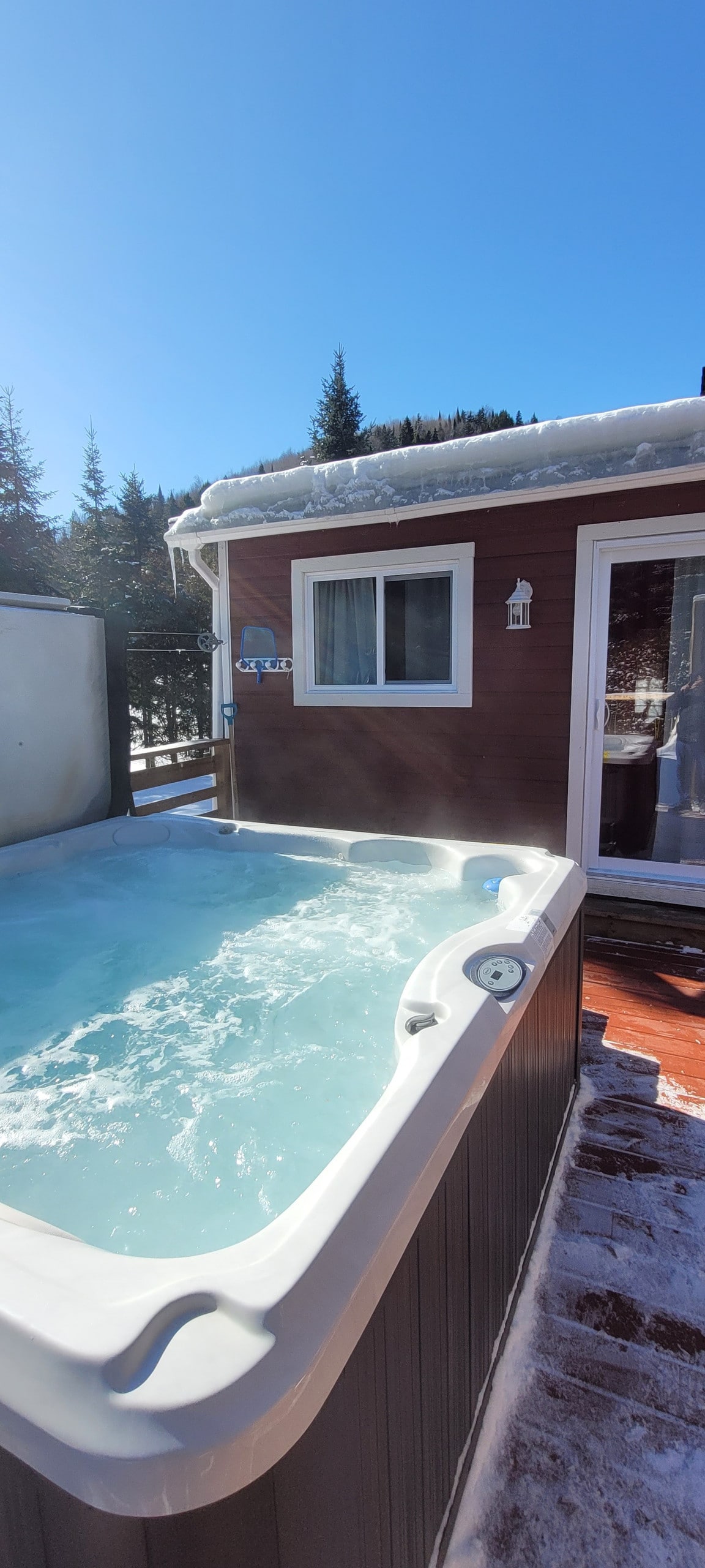Vivez la magie de l’hiver dans notre Chalet & Spa haut de gamme au cœur de la forêt. Enveloppé de neige et de tranquilité, ce chalet séduit par ses hauts plafonds, sa fenestration spectaculaire et son ambiance chaleureuse. Détendez-vous dans le spa chauffé sous les flocons, près du feu intérieur ou extérieur. Profitez du plancher chauffant, du BBQ hivernal et du wifi haut débit. 3 chambres, 2 salles de bains, 6 lits ultra confortables. À proximité : sentiers, ski, raquettes et lacs gelés.