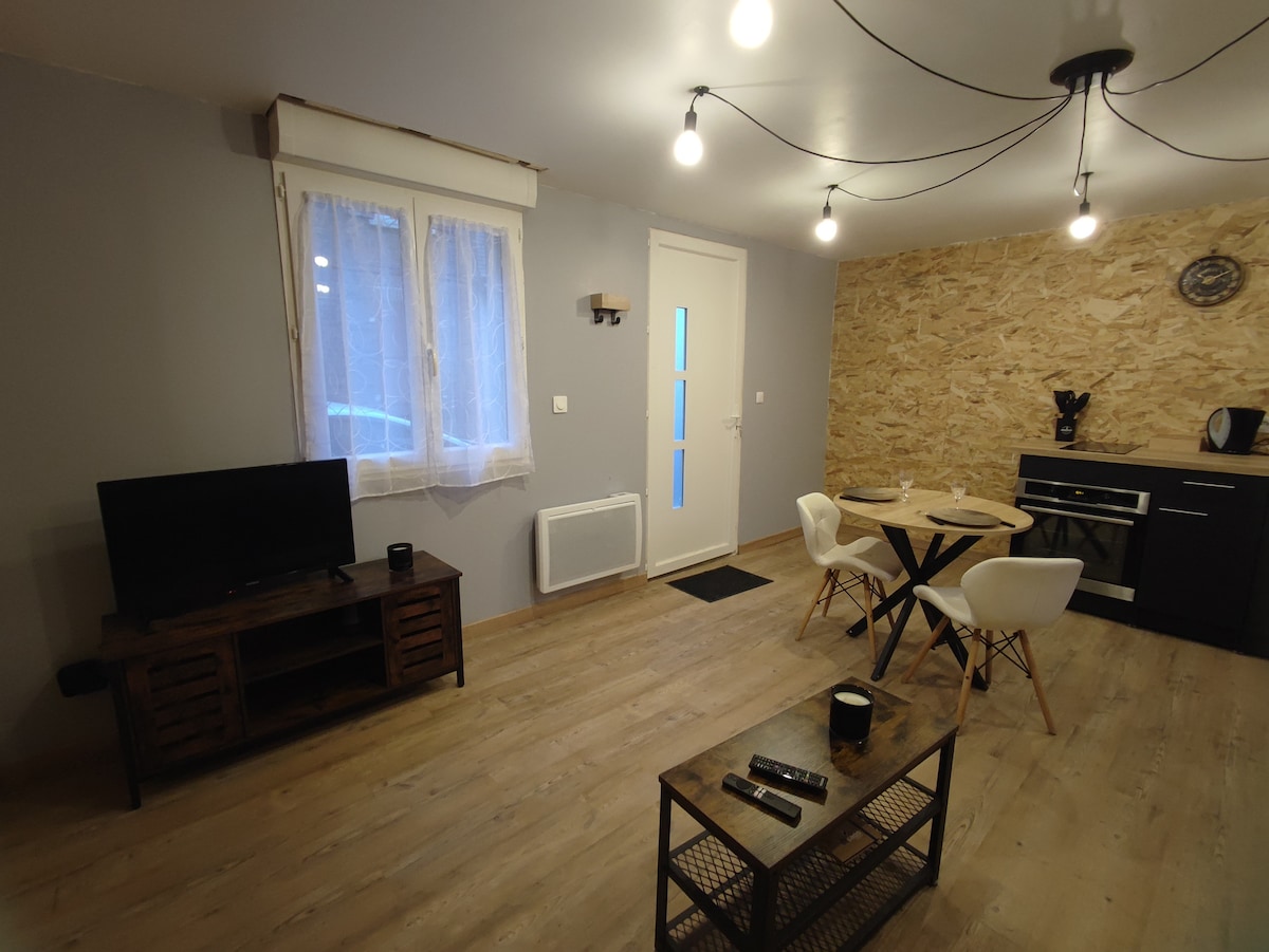 Appréciez le calme de cette pièce indépendante de 18m2 dans ma belle maison en pierre . Elle est décorée dans un esprit atelier cosy. ✓ Entrée indépendante ✓ Terrasse ✓ Forêt à proximité ✓ Lit "Queen Size" fait à l'arrivée ✓ Salle d'eau privative avec WC suspendu ✓ Serviettes de toilettes fournies ✓ Wifi ✓ Télévision ✓ Bouilloire avec sachets de thé et café soluble ✓ Mini Frigo ✓ Place de parking N'oubliez pas vos chaussons ;)