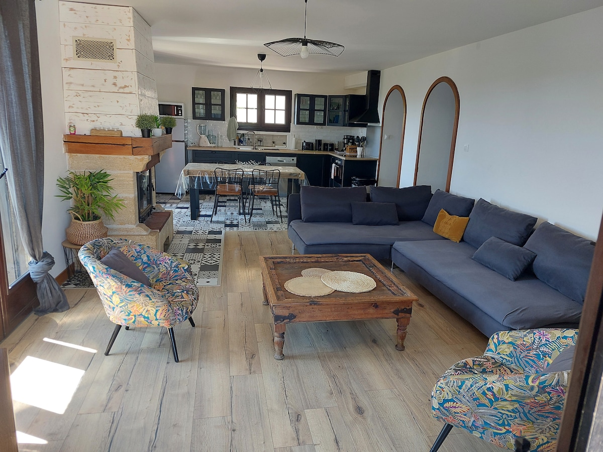 Entièrement rénové, ce loft moderne est composé de 2 chambres, une avec un lit double en 180 et l'autre avec 2 lits simples. Une grande cuisine entière équipée ouverte sur le salon avec cheminée et donnant sur une grande terrasse privative close et sans vis à vis. Vous pourrez profiter de l'espace piscine qui comprend une grande piscine mais aussi une pataugeoire pour les plus petits, d'une cuisine d'été avec bbq au gaz et brasero Nous sommes situés à la campagne et un véhicule est nécessaire.