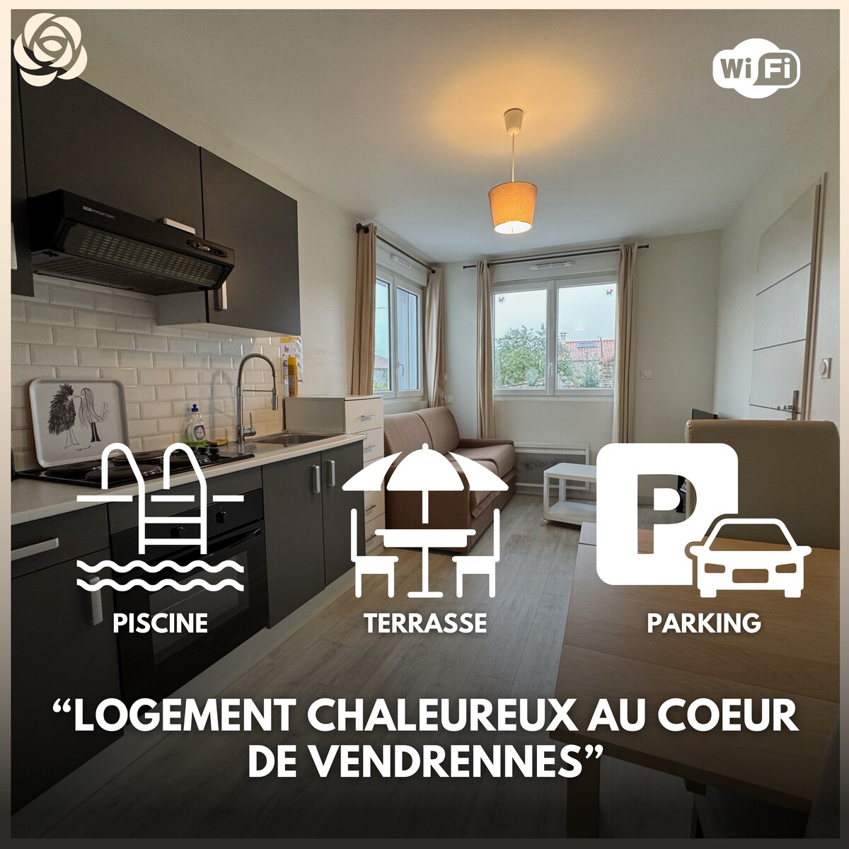 Au cœur du bocage Vendéen,en campagne, dans un cadre verdoyant propice au repos et à la détente, location d’un studio de 45m² entièrement rénové en 2019 et idéalement situé (à 5 minutes de l’échangeur A83-A87) pour un séjour couplant la visite du Parc du Puy du Fou (à 25 minutes environ) et la découverte de la côte vendéenne (moins d'une heure).