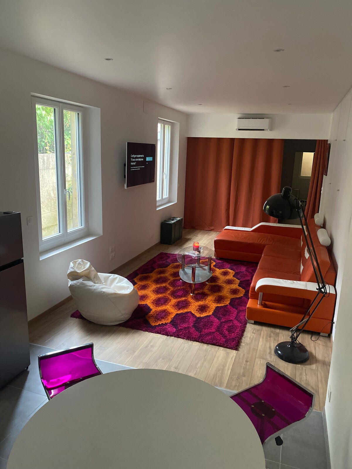 Appartement en rez de jardin , climatisé, totalement indépendant (arrivée autonome) et comprend une grande chambre : lit King size avec télé 40", une sdb avec wc, cuisine ouverte sur un salon avec un canapé convertible1,60m de bonne qualité à mémoire de forme. 1Baie vitrée vue sur un extérieur . Le logement dispose de 2 emplacements parking dans une cour fermée (vidéo). La propriété possède un étang où il est possible de se promener et de voir🦆🐿️ écureuils nous fournissons draps serviettes