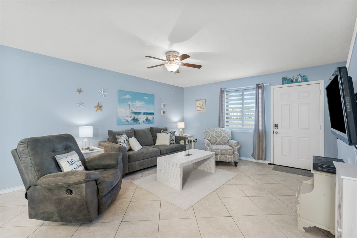 Escape to our cozy beachside townhome! You will love the quiet location steps from white sand beaches and clear blue water. Private & public beach access are right across the quiet street and you'll enjoy a private community pool, fast WiFi, Smart TVs, and washer/dryer combo. Our quiet neighborhood is minutes away from restaurants, putt putt, the zoo, state park, and many other family attractions. It is literally a 1-minute walk from the front door to sand!