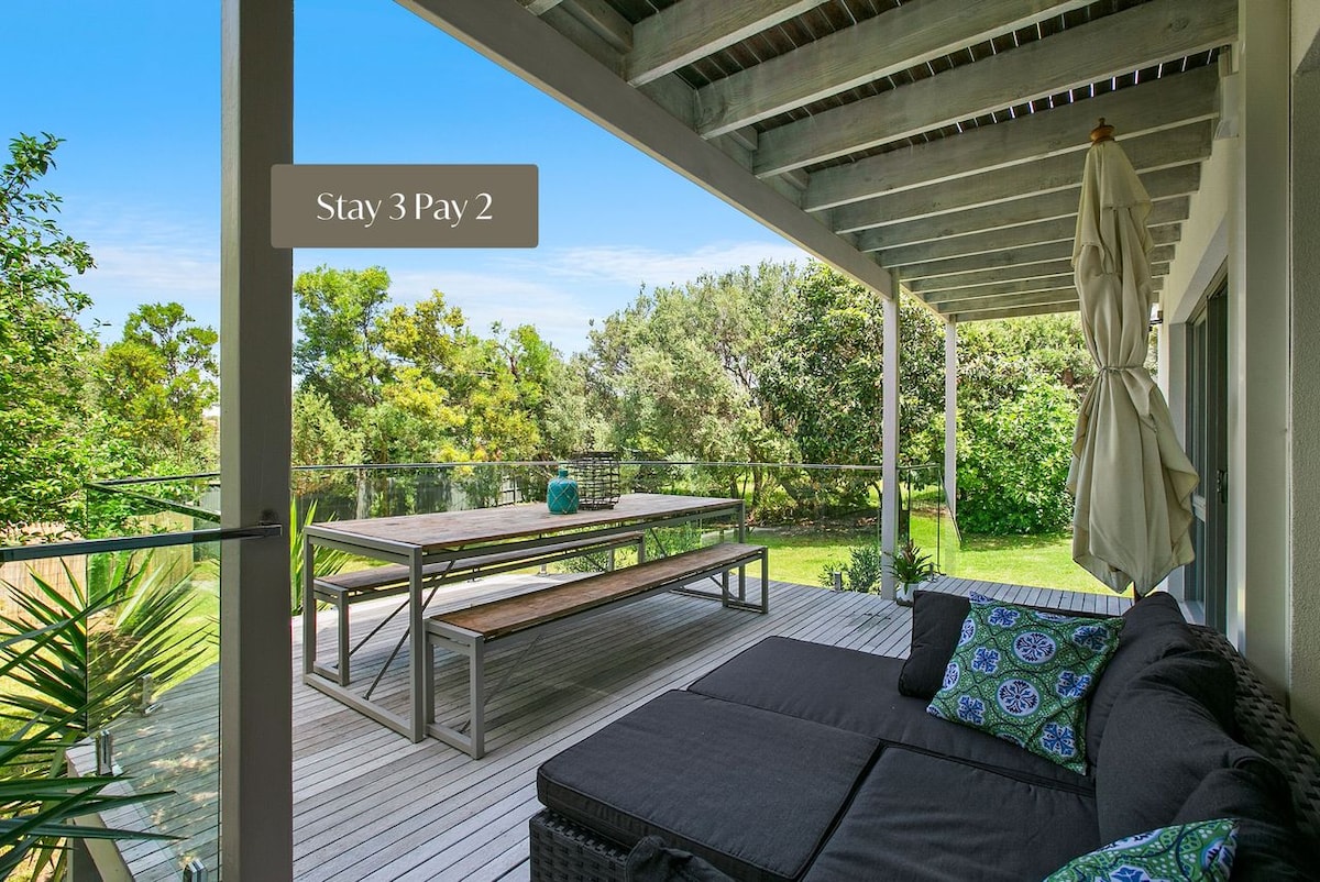 Unwind in this light-filled beach house, just 2km from the beach & Peninsula Hot Springs-perfect for a relaxing getaway. Enjoy your morning coffee or afternoon wine on the spacious deck, complete with fireplace & tree-top views. Sleeps up to 6 guests across 3 queen bedrooms, each with ample wardrobe space and a full-length mirror. Enjoy free WiFi, a 65” Smart TV & board games. Cook with ease in the fully equipped kitchen. Plus, enjoy aircon/heating, a bath, laundry & ample parking.