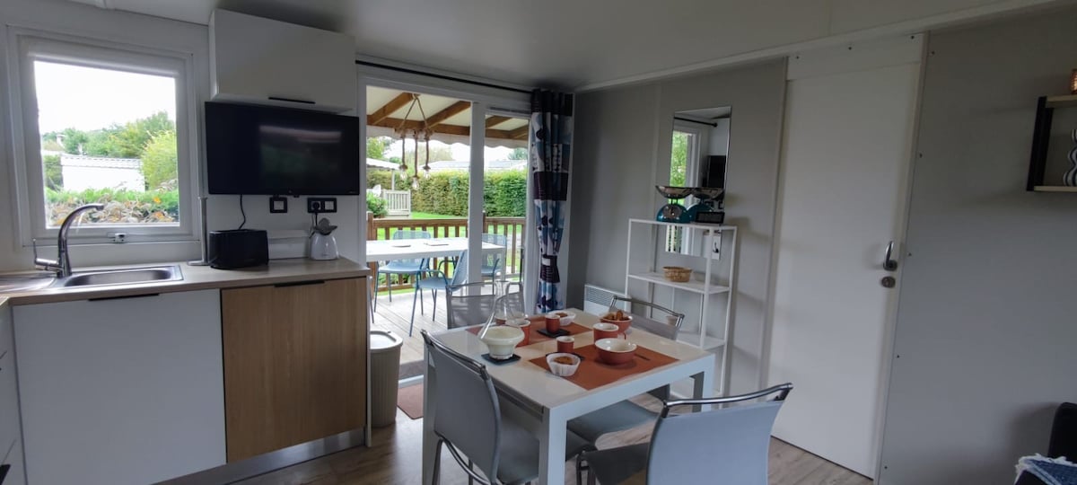 Bienvenue dans notre mobil-home installé au camping de la Vallée 5*, à l'orée de Deauville. Notre mobil-home, confortable, récent et lumineux, est équipé de 2 chambres, 2 salles de bain, 2 WC et d'une terrasse semi-couverte, en prolongement de l'espace intérieur. Le camping dispose d'un complexe aquatique extérieur et d’une grande piscine intérieure. Parmi les autres services : une salle de sport, des jeux pour enfants et un grand étang pour pêcher et se promener.
