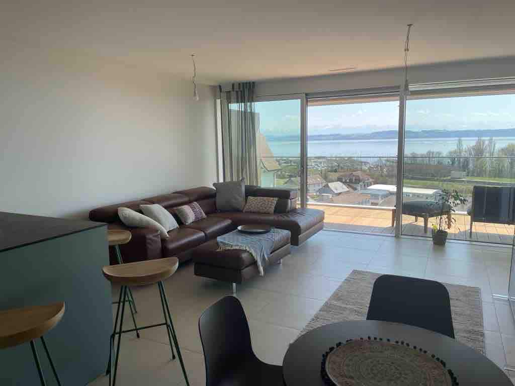 Situé entre lac et montagnes, charmant duplex dans une maison individuelle. Vaste terrasse offrant un magnifique panorama et accessible depuis le séjour et la cuisine moderne/récente. Deux chambres à coucher avec chacune salle-de-douche ou bain/WC. Une place de parc mise à disposition.