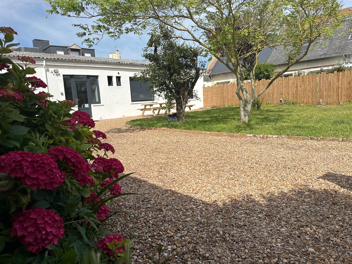 Maison refaite à neuf de 90m2 à 150m de la plage Non accessible PMR. Petite cour fermée avec terrasse sud Barbecue à disposition Commerces à proximité Bernières est une station balnéaire familiale en plein cœur des plages du débarquement Nombreux équipements aux alentours: école de voile, piscine, mini golf, centre équestre, skate Park, musées 2ème guerre Place à 2 voitures devant portillon Linge en supplément: 10€ par lit serviettes de toilette: 5€ par pers
