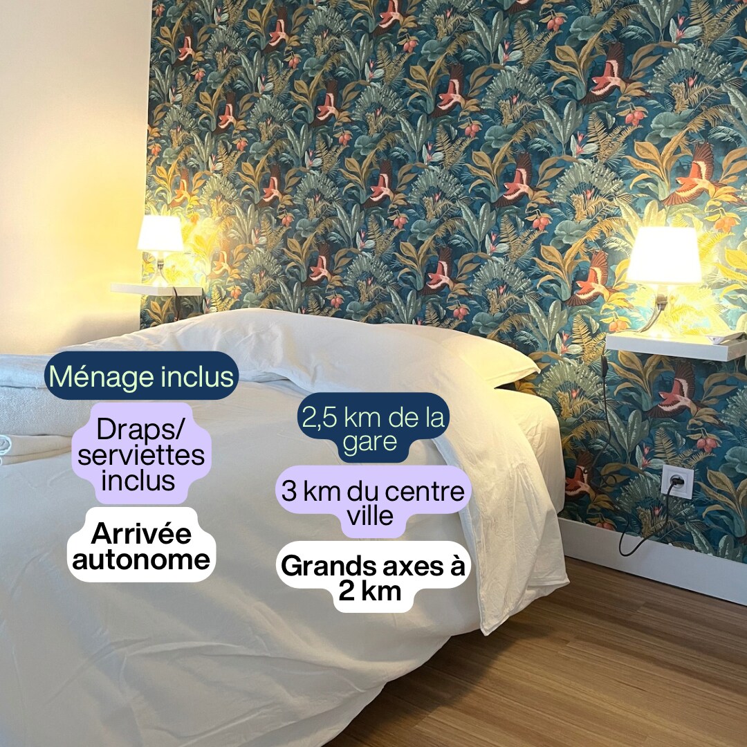Appartement T2 entièrement rénové dans un style contemporain, spacieux (42 m²), très lumineux et fonctionnel . Il se situe dans une résidence de standing très calme et arborée. Terrasse exposée sud sur parc sans vis à vis . Parking privatif et garage à vélos. A proximité immédiate du centre historique (15-20 min à pieds, 5 min en voiture ou bus). Commerces à pieds et lignes de bus en bas de la résidence. 2 Velos mis à disposition à titre gracieux Tout équipé.