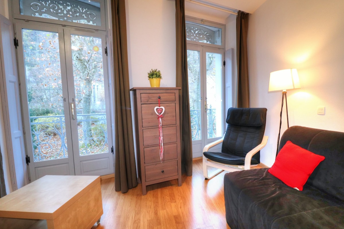 Beautiful, light and great views 52 sq 2 bedroom apartment on the first floor in a historic Haussman building. Fantastic balcony with views of the mountains. Wi Fi and Cable TV available. This apartment has a secure ski and bike cellar. Fully equipped kitchen. Central heating throughout the apartment. Towels and linen are provided. Situated very central, close to shops, Thermal Baths and Ski lift. Free parking spaces opposite the front entrance.