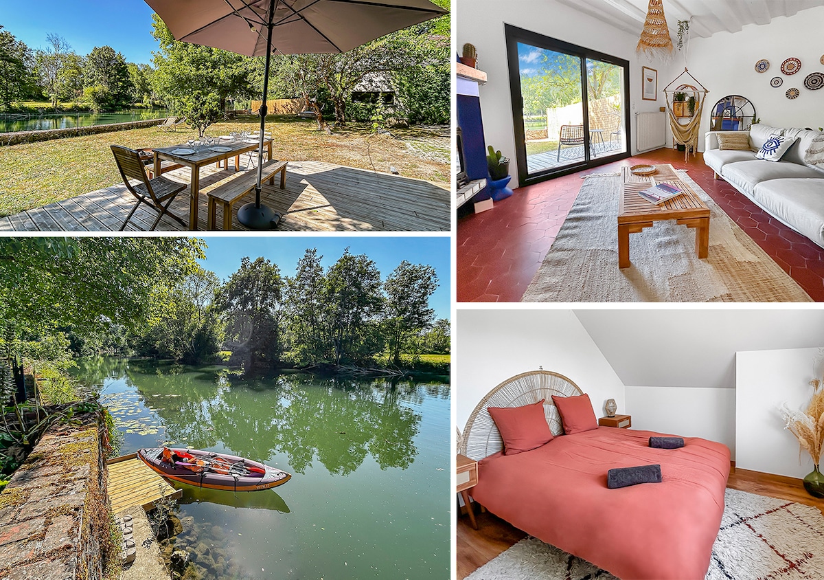Maison cosy avec jardin, rivière et ponton privé.