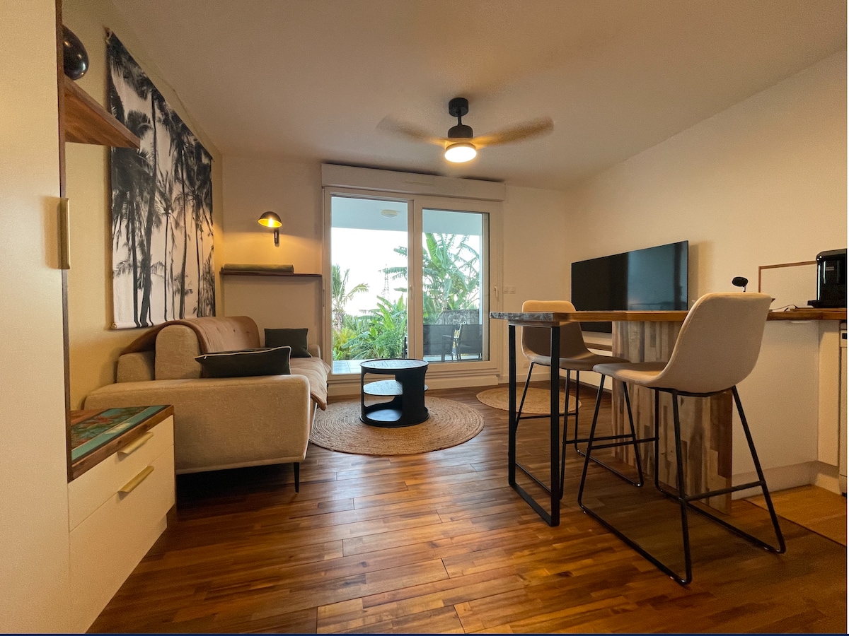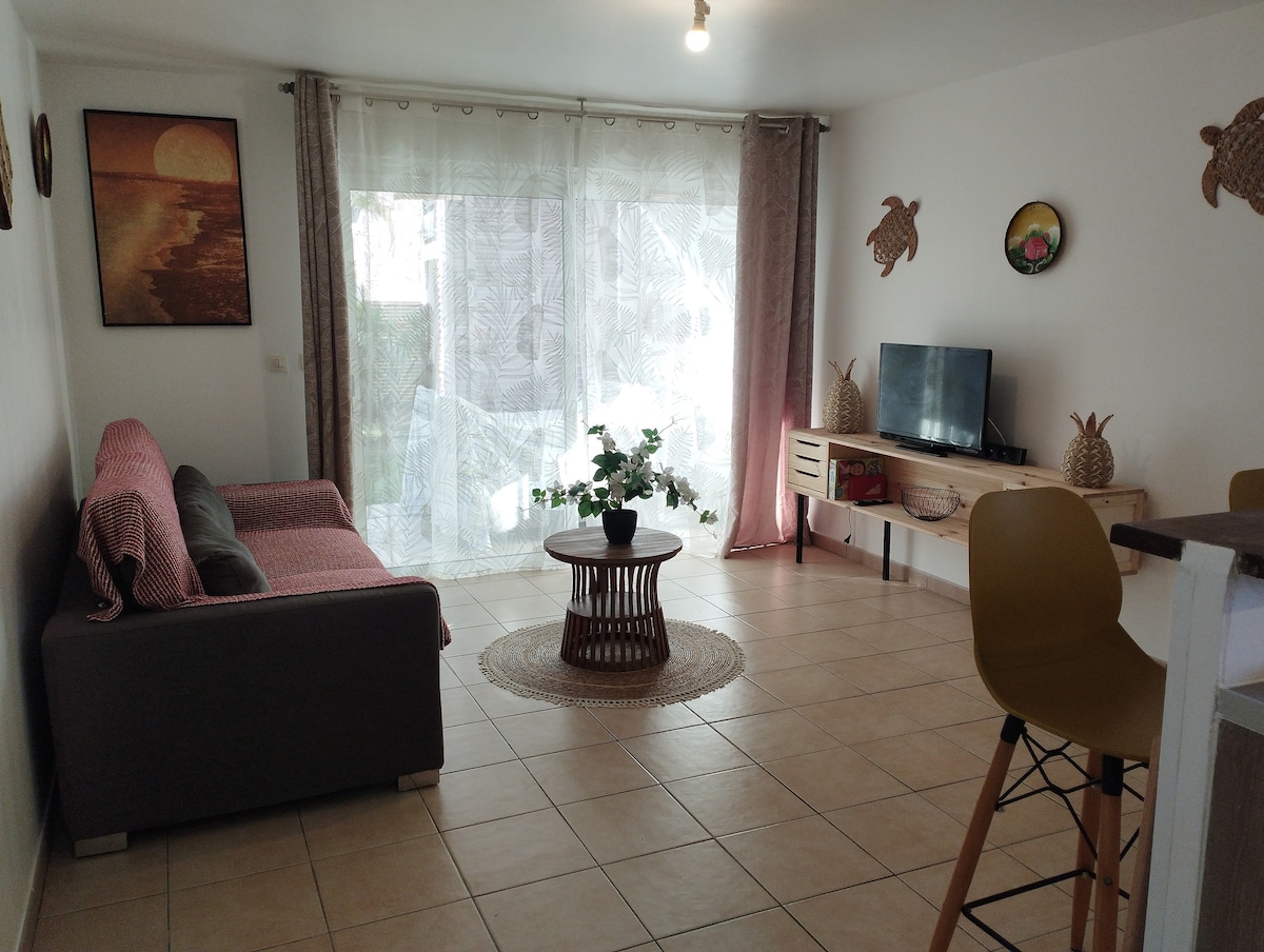 Situé dans un lotissement au sein d'un domaine naturel préservé, Sweet Moka vous accueille avec pour objectifs : le bien-être et la détente. Vous profiterez d'un appartement de 32m2 tout confort avec une chambre, une mezzanine, un séjour-cuisine ouvert, un extérieur de 60m2 avec jacuzzi 5 places et terrasse... Le tout avec vues mer et montagne, au calme. Le plus : un home gym avec équipement pro. La localisation est idéale : 10 mn de l'aéroport, 5 mn des commodités et 20 mn de Saint Denis.