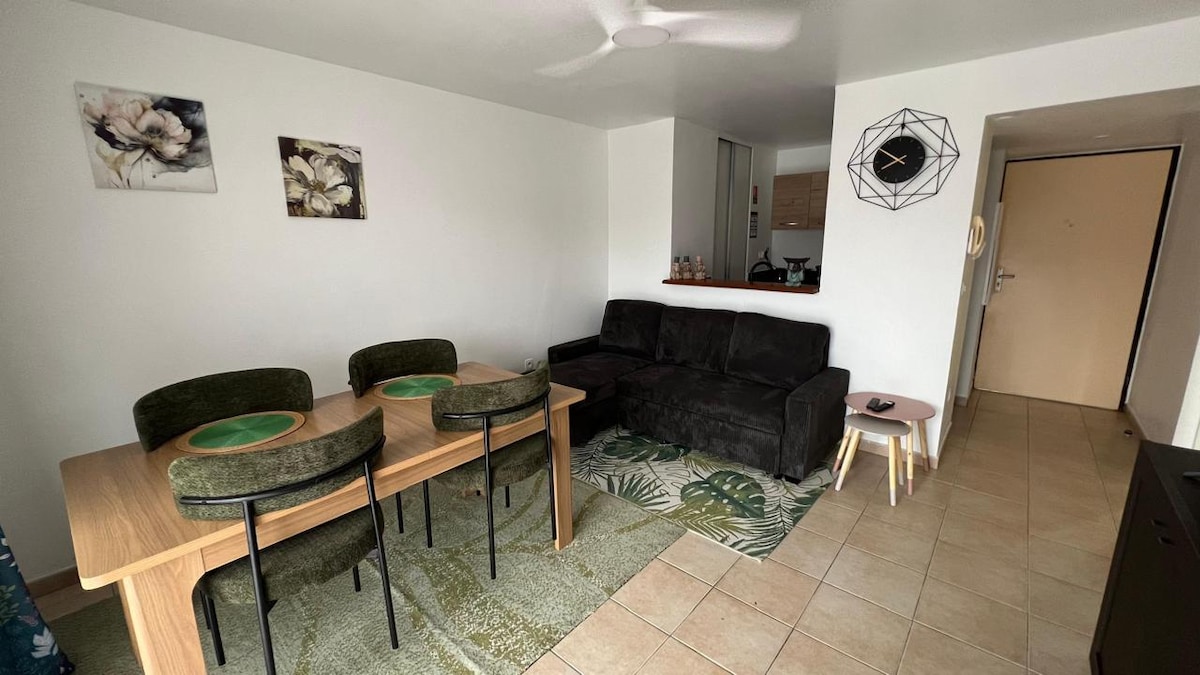 Rapprochez-vous de vos êtres chers dans cet élégant logement qui peut accueillir 4 personnes max et un bébé. Nous mettons à votre disposition du matériel pour bébé sur demande. Il se compose de deux chambres avec salle de bain, d'une cuisine entièrement équipée ouverte sur un salon et une terrasse. Le logement est climatisé et se situe de plain pied. Vous profiterez des installations extérieures telles que jardin, piscine , patio, douche extérieure et parking gratuit sécurisé.