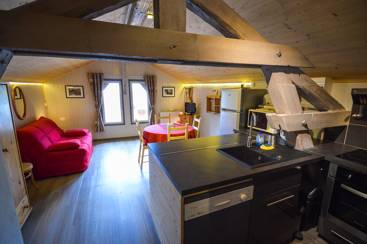 Appartement chaleureux de 2 pièces (36m²), mansardé avec poutres apparentes, pouvant accueillir jusqu’à 4 adultes, dans une ancienne grange rénovée d’un petit village savoyard. WIFI et casier à ski gratuits. À 6 kms des remontées mécaniques les plus proches (Courchevel Le Praz) ou 10 min avec la navette. Appartement non accessible aux personnes à mobilité réduite.