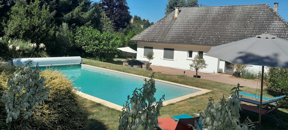 Besoin de calme et de vous retrouver en famille ? Cette belle maison en pierres vous attend pour un séjour dans un écrin de verdure. Il n'y a pas de doute vous allez tomber amoureux de la vue à 360° sur toute la région roannaise et les monts du Forez ! Si vous avez des enfants, ils trouveront tout ce qu'il faut pour passer un super séjour : salle de jeux bien remplie, jeux de société, billard pour les plus grands, piscine couverte et chauffée de mai à septembre, espace de jeux extérieur ...