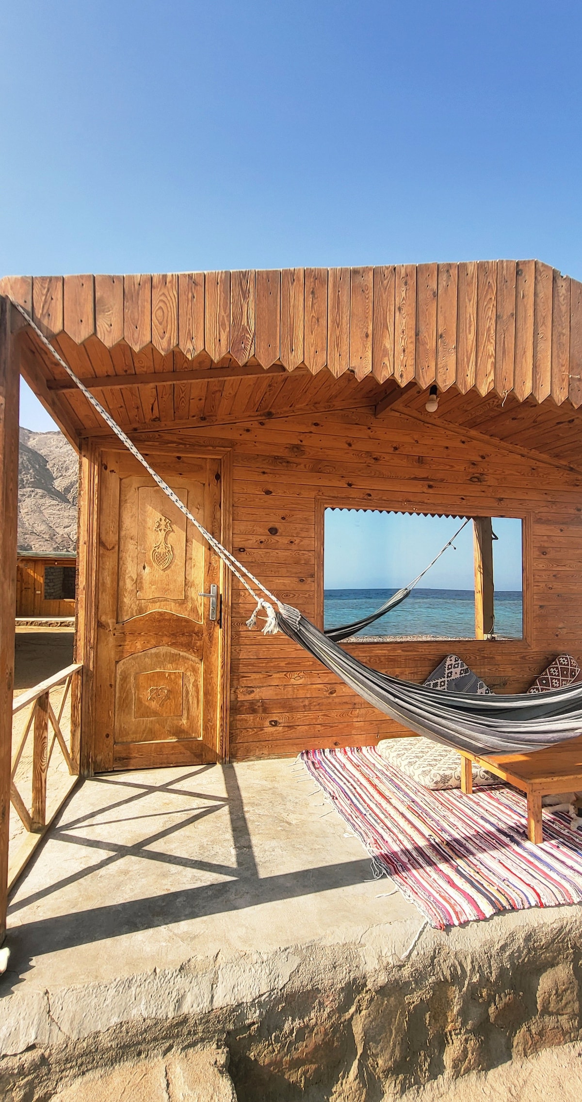 Private & cozy 2BR house by the sea in Dahab canyon. 2 bathrooms, full kitchen, 2 ACs, handcrafted decor, outdoor dining & sport areas. Private entrance, garden, pool & sea access. 10min to Assala & Blue Hole. منزل خاص ومريح بغرفتين نوم وحمامين في وادي دهب قرب البحر. مطبخ مجهز، ٢ مكيفات، ديكور يدوي، مناطق خارجية للطعام والرياضة. مدخل خاص، حديقة، مسبح، وإطلالة بحرية. ١٠ دقائق من العصلة وبلو هول.