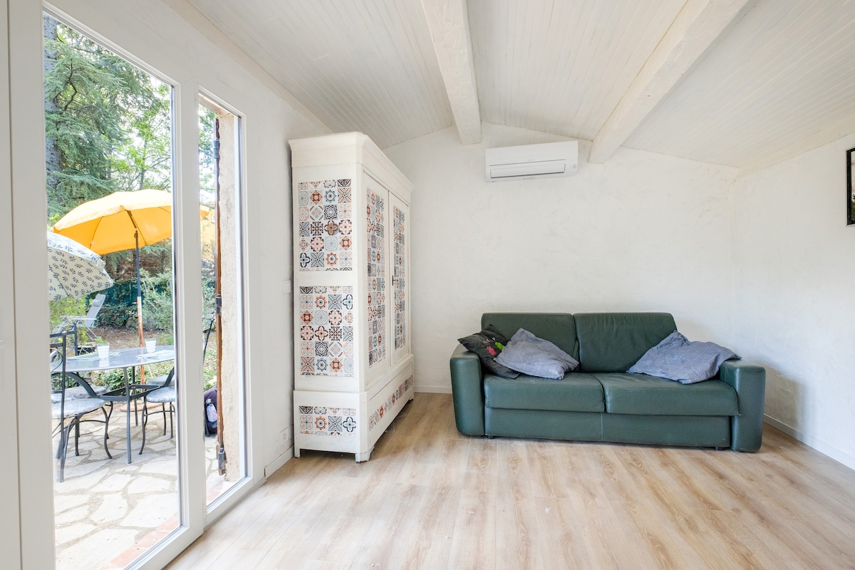 Beau studio meublé 21m² avec salle d'eau-WC, en rez de jardin d'une villa, avec terrasse privée 16m², dans village pittoresque du centre Var, à 30 km du bord de mer et des Gorges du Verdon. Cuisine intégrée et très bien équipée, lit 2 personnes 140x190, canapé 2 places convertible en méridienne ou en lit 1 place pour enfant. TV TNT SAT. Climatisation. Lave-linge et Lave-vaisselle, multiples équipements et produits fournis. Non fumeur / Pas d'animaux. Classement 2 étoiles aux Gîtes de France.