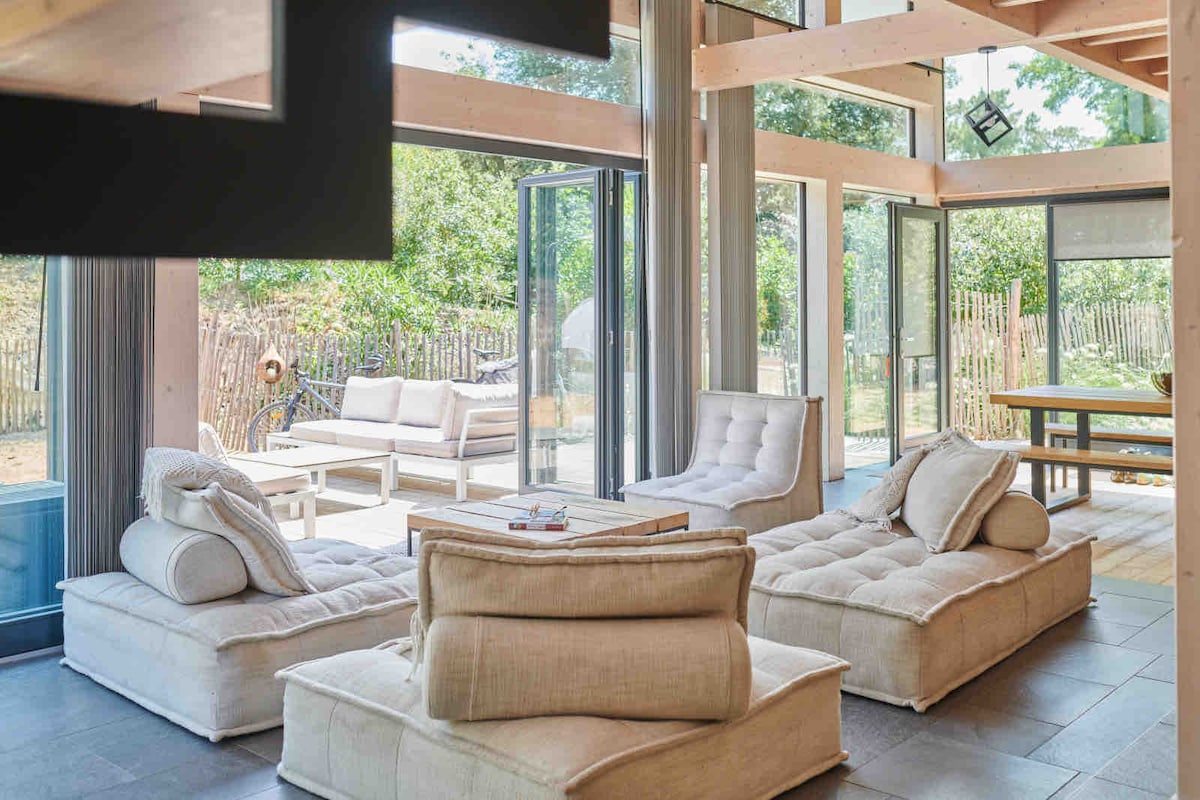 Modern & very bright chalet in solid wood composed of 3 bathrooms and a sauna. Walking distance from the Villa: forest protected area, beach access 400 meters away, water activities base and bike tours. Cozy atmosphere guaranteed! Ala Moana "On the way to the sea" in Hawaiian - Enjoy the sounds of the waves from a spacious garden, feet in the sand. - Ch 1: Double bed + double shower + XL bathtub - Ch 2: Double bed + crib - Ch 3: Double bed + Single bed - Mezzanine- Double sofa bed