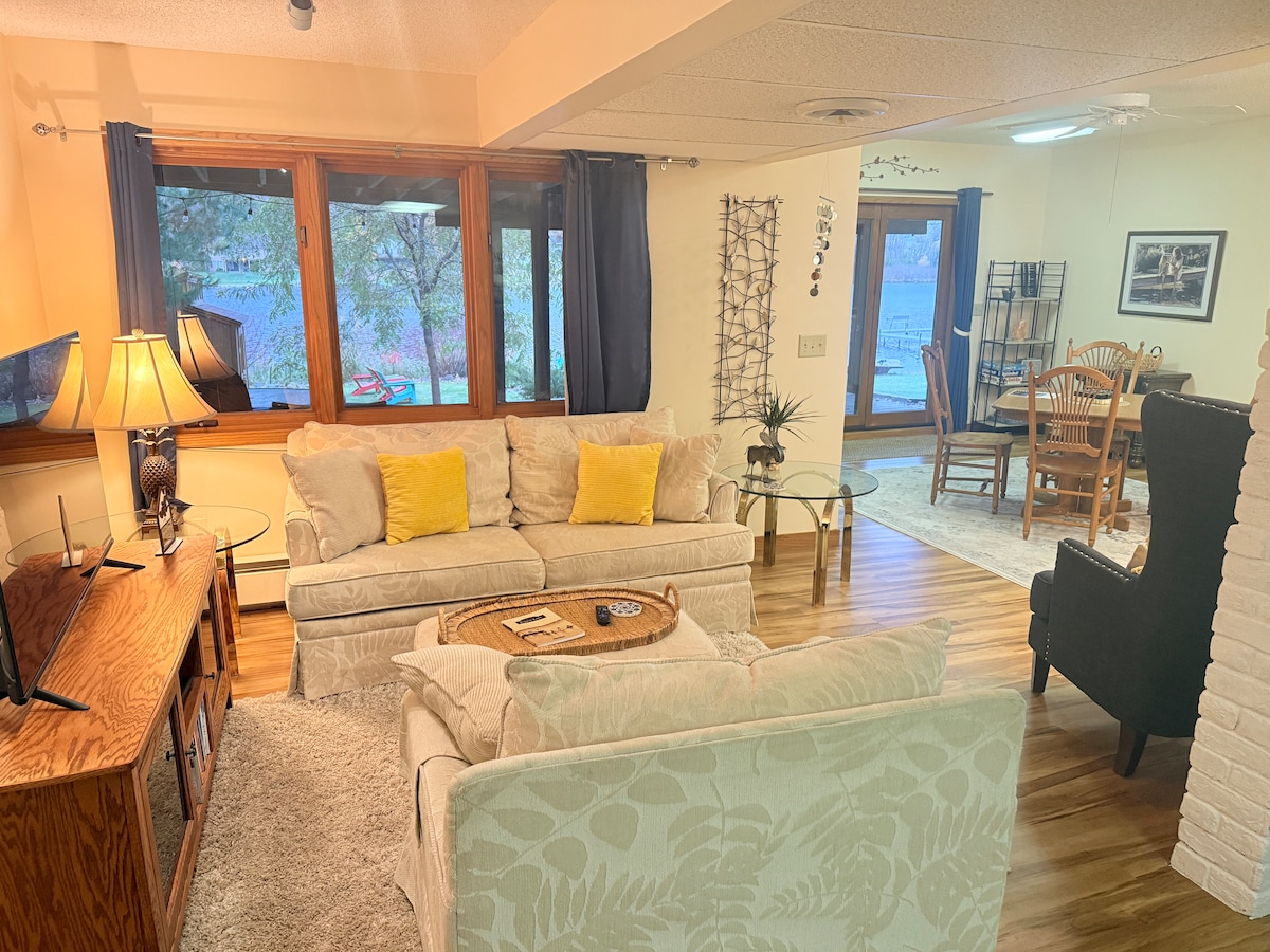 Your private family lake escape! Fully updated, tranquil and relaxing, yet modern. Relax and enjoy the lake from the deck or picnic areas. Cast a line from the dock or hop in the provided kayaks or mini pontoon! Enjoy a warm bath in the new jacuzzi tub & breathtaking double-shower, then cozy up to a movie in front of the electric fireplaces! BBQ grill & flat top included. Large loft w/ 2 queen beds & master bedroom w/ king. Perfect for priceless family memories on the lake. Fiber internet, too!