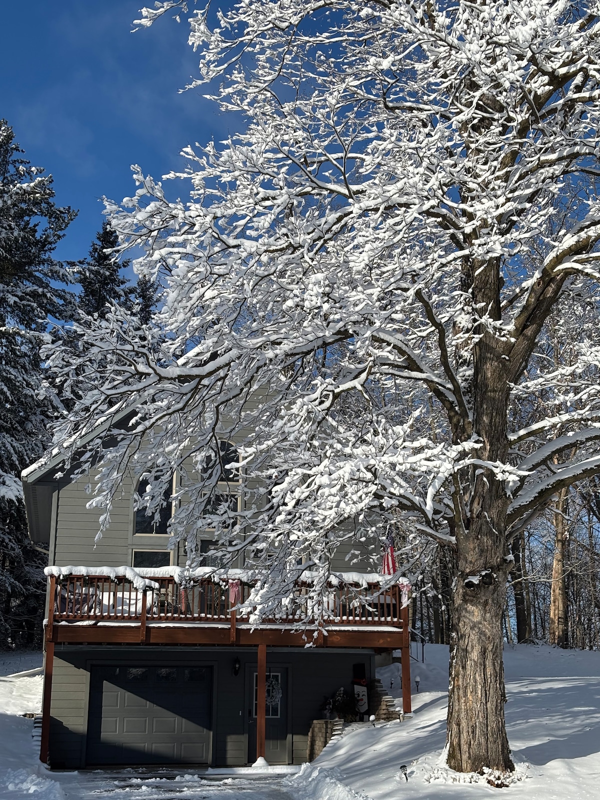 Perched high in the majestic arms of a 150 year old Burr White Oak tree. This cozy 1200 square foot, seven-room house not only has breathtaking views it also has enchanting and delightful surprises befitting of a fairytale. Climb 40 feet up onto the Observation Tower, where a telescope waits for you, ready to scan the night sky, and reveal the panorama of the heavens -- overlooking 500 acres of natural splendor right next door. Step into the hot, bubbling jets of the jacuzzi, or warm caress of the rain shower, and restore your spirits by soothing your muscles, melting away any residual tensions of the day. Get a restful sleep in one of our soft beds. In the morning, pad around on in-floor radiant heated floors (so cozy during winter-time.) Or enjoy your morning coffee on one of four outside decks. And don’t forget to solve the mystery of the Treehouse, that awaits your discovery within its wood beamed walls. This treehouse was custom designed by its architect with three dimensional chess in mind. Artisan architectural details are found throughout. Crystal chandeliers bedeck its high ceilings, and marble countertops grace the elegant, fully appointed kitchen. (A surround sound system helps set the mood for those special dinners in the dining nook.) One of two fireplaces adds luxurious touches to the primary bedroom with a queen bed, and hideaway bed in the secret room, along with a jacuzzi and rain shower in the primary bath, as well as a second bathroom in the secret room. Perfect for honeymooners, couples, business/corporate overnights, solo travelers and families with children over twelve years old. These are only a few of the many luxury details in this spectacular vacation spot must-see. Spend your days snuggled up beside the fireplace of your choice, while enjoying the panoramic views. You can stream your favorite movies and shows with Broadband Wi-Fi throughout the house. Come down for a leisurely walk around the grounds, and stop by to visit and feed the goats and chickens that call Hope Glen Farm their home in the corral of this historic farmstead. Bring your stress levels down and your heart rate up by walking over to Washington County Cottage Grove Park Reserve, just steps away, and answer its call to explore over 550 acres of fields and forests. Go hiking and biking down its trails, geocaching the hills and ravines for hidden treasures, or spend the afternoon fishing and kayaking in the lakes. And don’t let cooler temperatures keep you from discovering the pristine natural beauty of winter! Winter activities include cross country skiing and snowshoeing on the blankets of snow. Breathe deeply of the crisp Minnesota winter air -- truly one of life’s great pleasures. Plus, only a ten minute drive brings you to nearby Afton Alps in Afton State Park offering downhill skiing and snowboarding. For clarity, the Treehouse has 2 private bedrooms: Bedroom 1 is has a queen bed. Bedroom 2 has a bedroom with standard sofa bed with attached half bathroom, which is the secret room a must find. Give yourself the gift of this luxurious enchanting TreeHouse Suite in the treetops, for a enchanting vacation experience you'll never forget. Something to write home about!