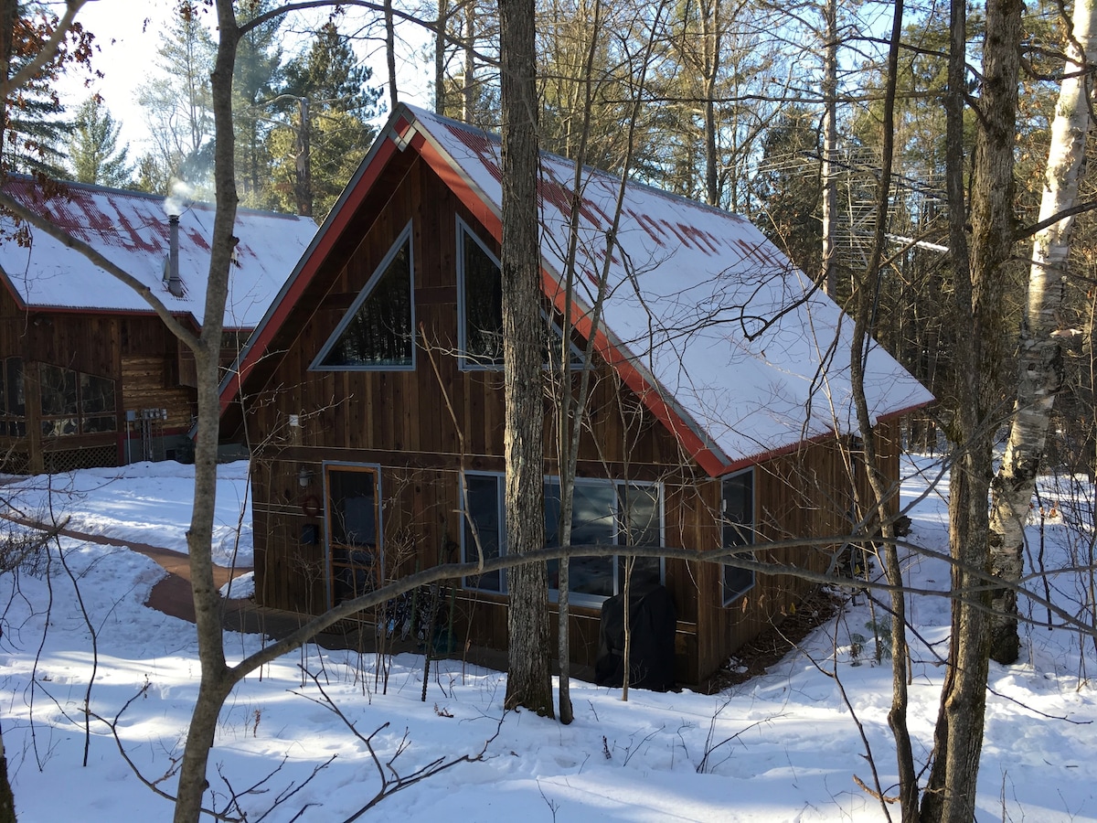 New 520 sf 'not too tiny' house on 20 wilderness acres. Year 'round fun. Dog friendly. RV & EV plug. Firepit. Your Snowshoe Creek and Little Wood Lake trails. Free canoe, kayak, paddleboat. $40/day mini-pontoon boat. Fishing. Internet. WiFi. AC. Gas Fireplace. Sleep by Number. Lovely bathroom. New gas stove. Ice maker. 2 TVs. 3 towns + Burnett Dairy/Bistro, 4 golf courses, DQ to fine dining, mini-golf, antiquing, multi-theater, Siren beach & 'Music in Park'. Wildlife! You'll return.