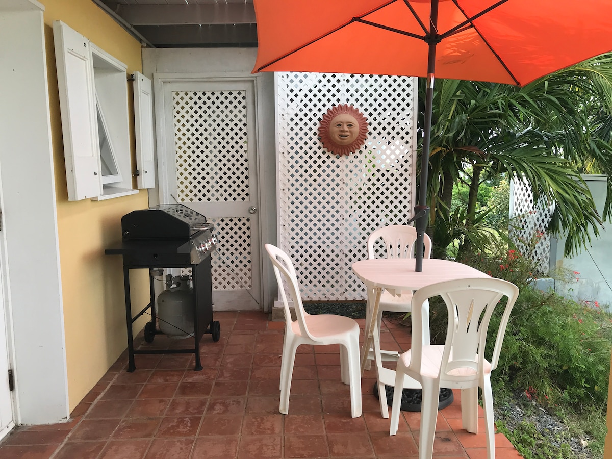 Studio apartment with a garden patio having a great view of the Caribbean and Buck Island. Located in the lovely neighborhood of Estate Green Cay - a 20 minute drive east of Christiansted. The path to Prune Bay beach is only a 3 minute walk away from apartment. There is also access (via foot or auto) to two other adjacent beachs: Cheney Bay and Coakley Bay The area is also great for jogging and strolling on quiet roads.