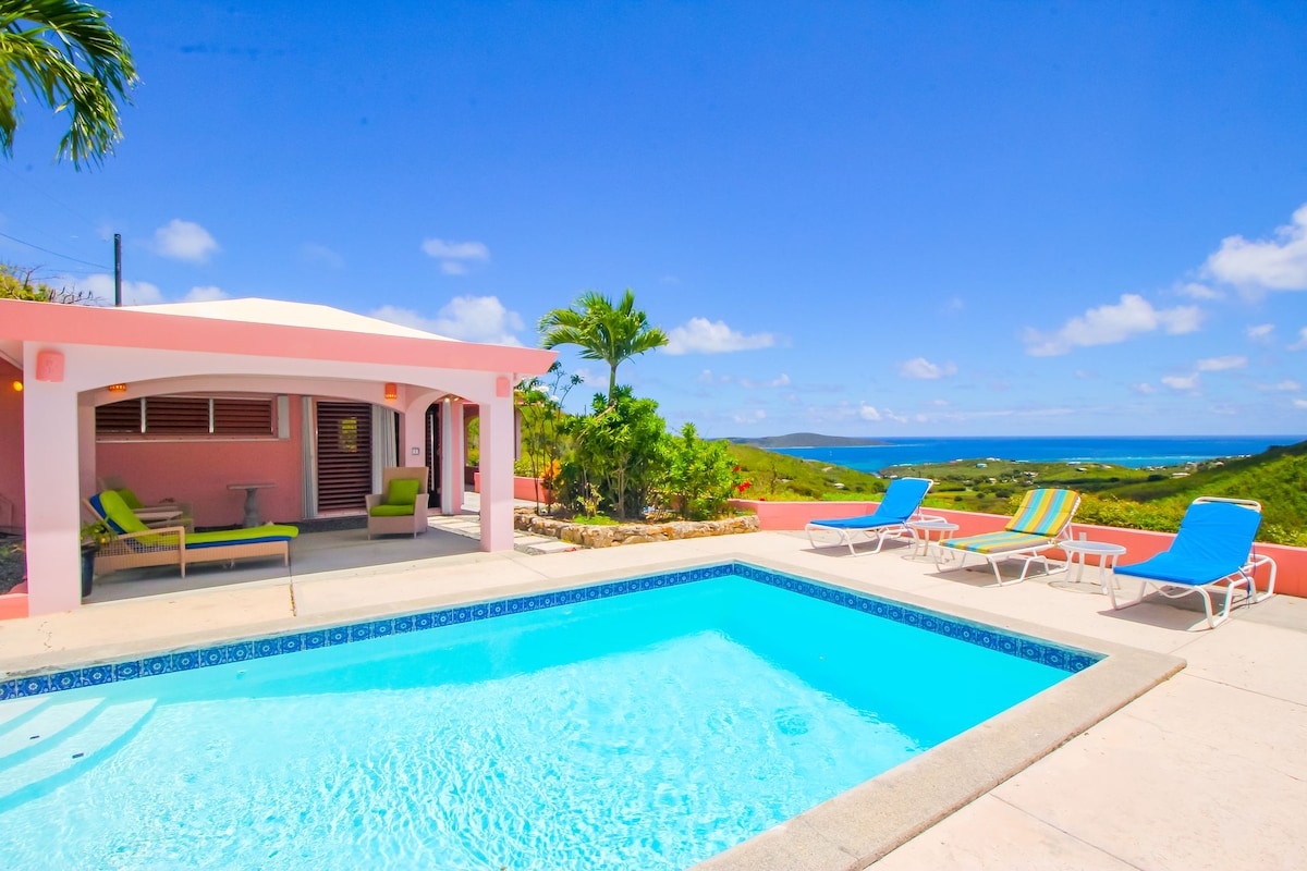 CARIBBEAN OCEAN VIEW OASIS This breathtaking Villa will be your Personal Paradise! Meticulously appointed mini- resort with all the high-end designer touches you enjoy. Whether your stretching out by Pool, Star-Gazing in the garden by the fire table.; you’ll be glad you booked Your vacation here! All 3 Bedrooms offer en-suite bathrooms Minutes from St Croix’s BEST beaches, and restaurants and shops. This properties’ unique location affords Breathtaking Sunrises AND Sunsets decks and pool.