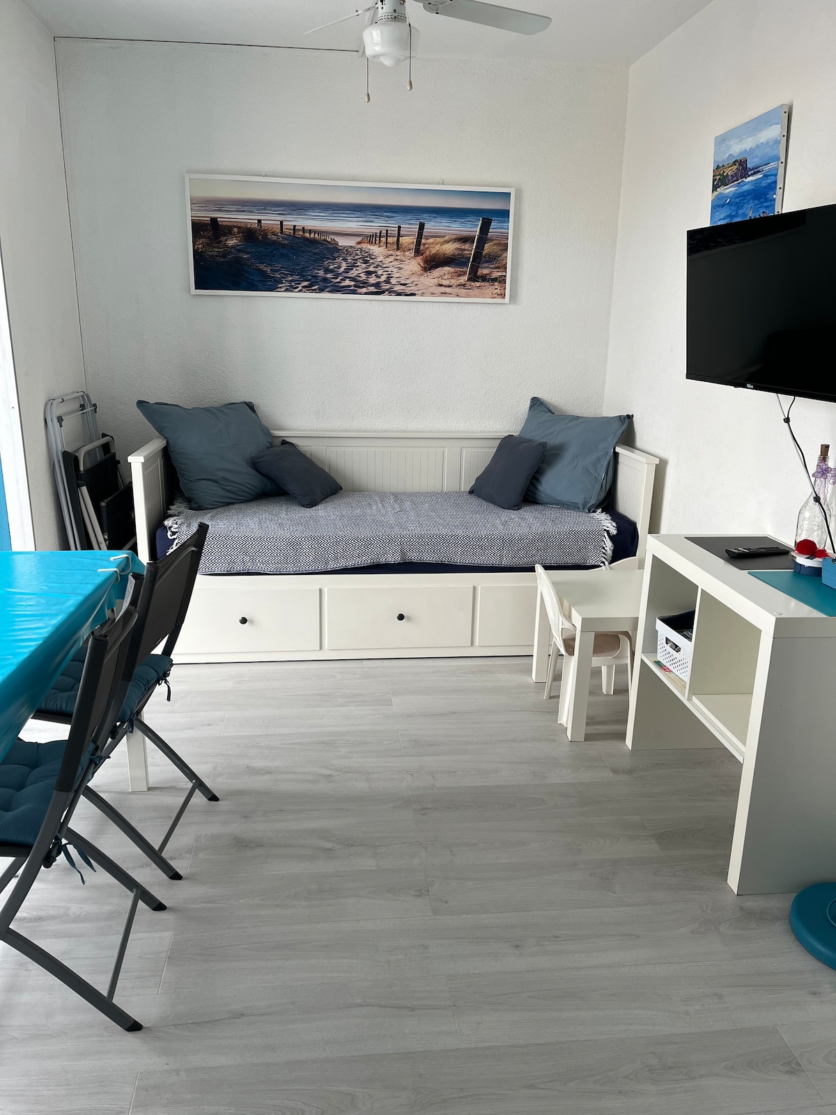 Appartement en front de mer, 6e étage avec ascenseur situé dans la résidence Casino au pied même de la place Méditerranée.ENTRÉE A L’ARRIÈRE DU BÂT Refait à neuf Peut accueillir 4 pers Non fumeur sauf sur le balcon ( Attention restaurant en bas pas d’eau) Parking sécurisé couvert sous l'immeuble inclus dans le prix+ parking aérien public gratuit toute l’année sauf juillet août. Smart TV 55’ HITACHI Fibre Machine à lavante séchante 8kg 5 kg LG 03/23 Cuisine équipée Climatiseur Mitsubishi 04/2