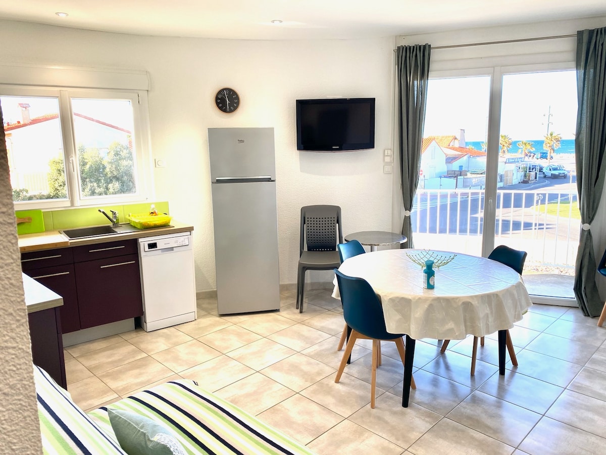 Appart T2, entièrement rénové , très lumineux avec jolie terrasse vue mer, dans résidence avec piscine à 20 mètres de la mer à pieds -1 chambre séparée, draps fournis, lit en 140 cm, TV -SDB avec baignoire, serviettes fournies -WC -entrée avec placard -Cuisine entièrement équipée (micro -ondes, cafetière Senséo, frigo/congélateur, plaque 4 feux, four, grille pain, lave-vaisselle, Lave-linge) - Séjour, couchage canapé rapido 140 cm, TV, WIFI - Terrasse vue mer et montagne avec table et chaises.