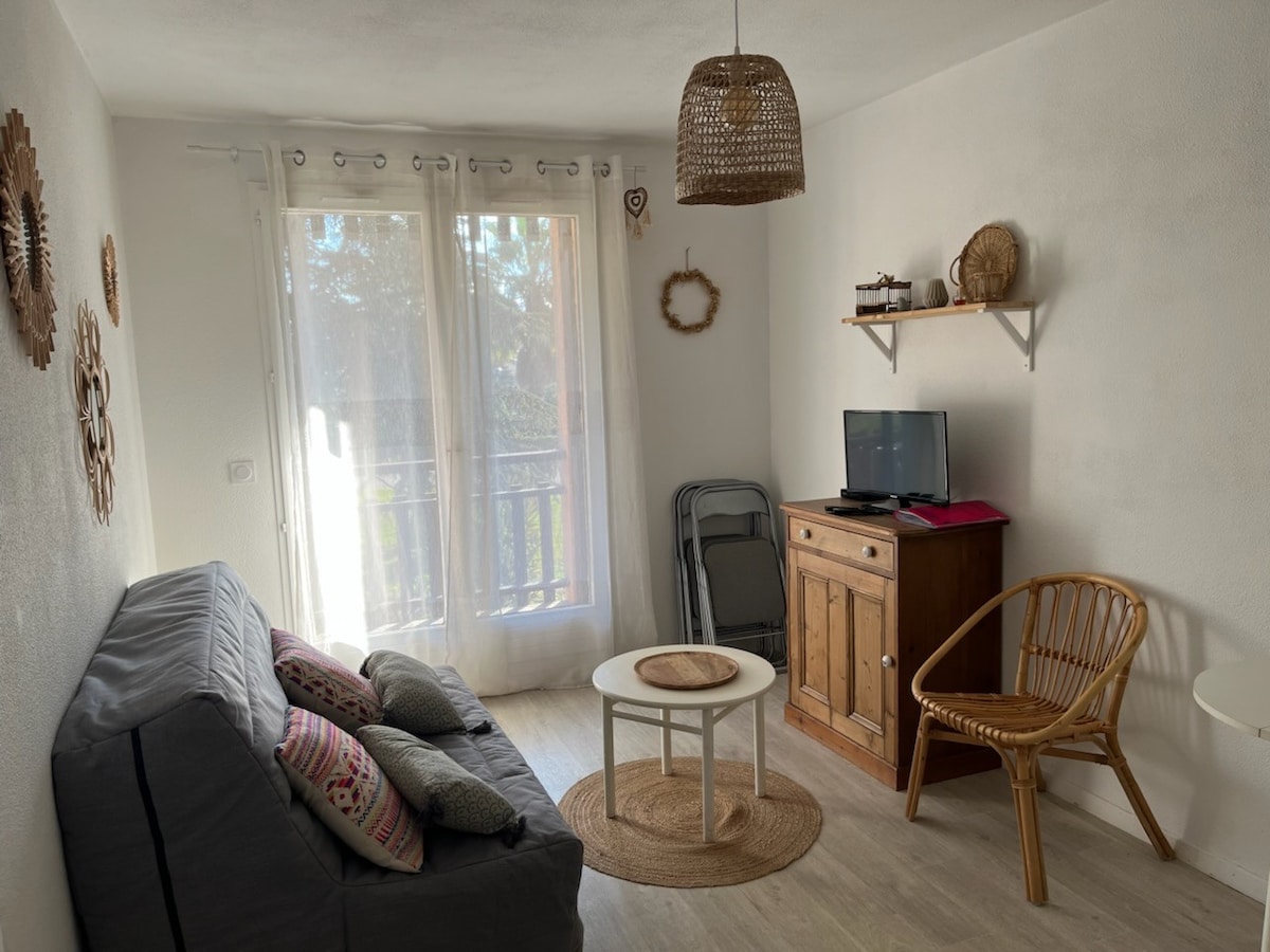 Appart T2, entièrement rénové , très lumineux avec jolie terrasse vue mer, dans résidence avec piscine à 20 mètres de la mer à pieds -1 chambre séparée, draps fournis, lit en 140 cm, TV -SDB avec baignoire, serviettes fournies -WC -entrée avec placard -Cuisine entièrement équipée (micro -ondes, cafetière Senséo, frigo/congélateur, plaque 4 feux, four, grille pain, lave-vaisselle, Lave-linge) - Séjour, couchage canapé rapido 140 cm, TV, WIFI - Terrasse vue mer et montagne avec table et chaises.