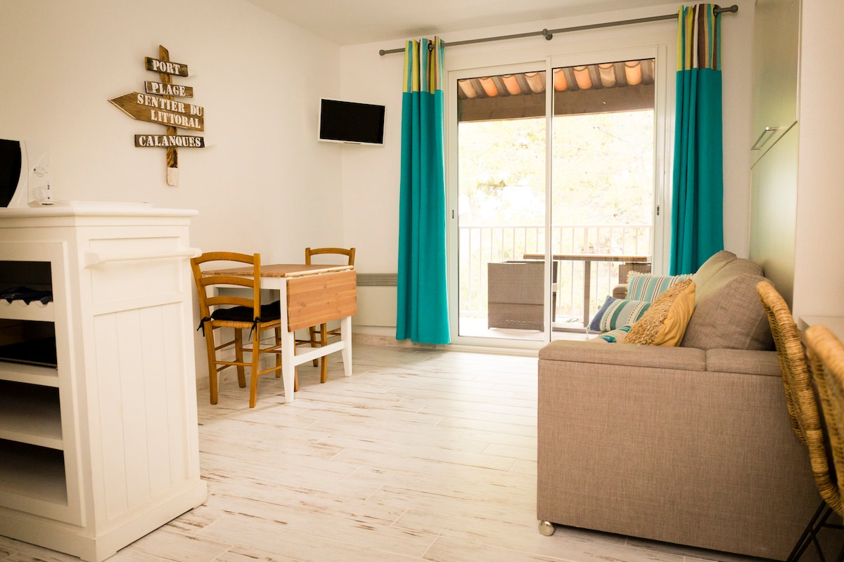Dans une résidence calme, à 300 mètres du Port de la Madrague, de la plage, des restaurants, des commerces, profitez d'un deux pièces avec terrasse, exposition sud, vue sur la pinède et aperçu mer. parking privatif. Nous avons soigné la décoration et l'équipement afin de rendre votre séjour le plus agréable possible. Vous disposerez de la fibre et d'une box TV. Appartement idéal pour une famille de 4 personnes (deux adultes et deux enfants)mais aussi pour un couple. LOGEMENT NON FUMEUR