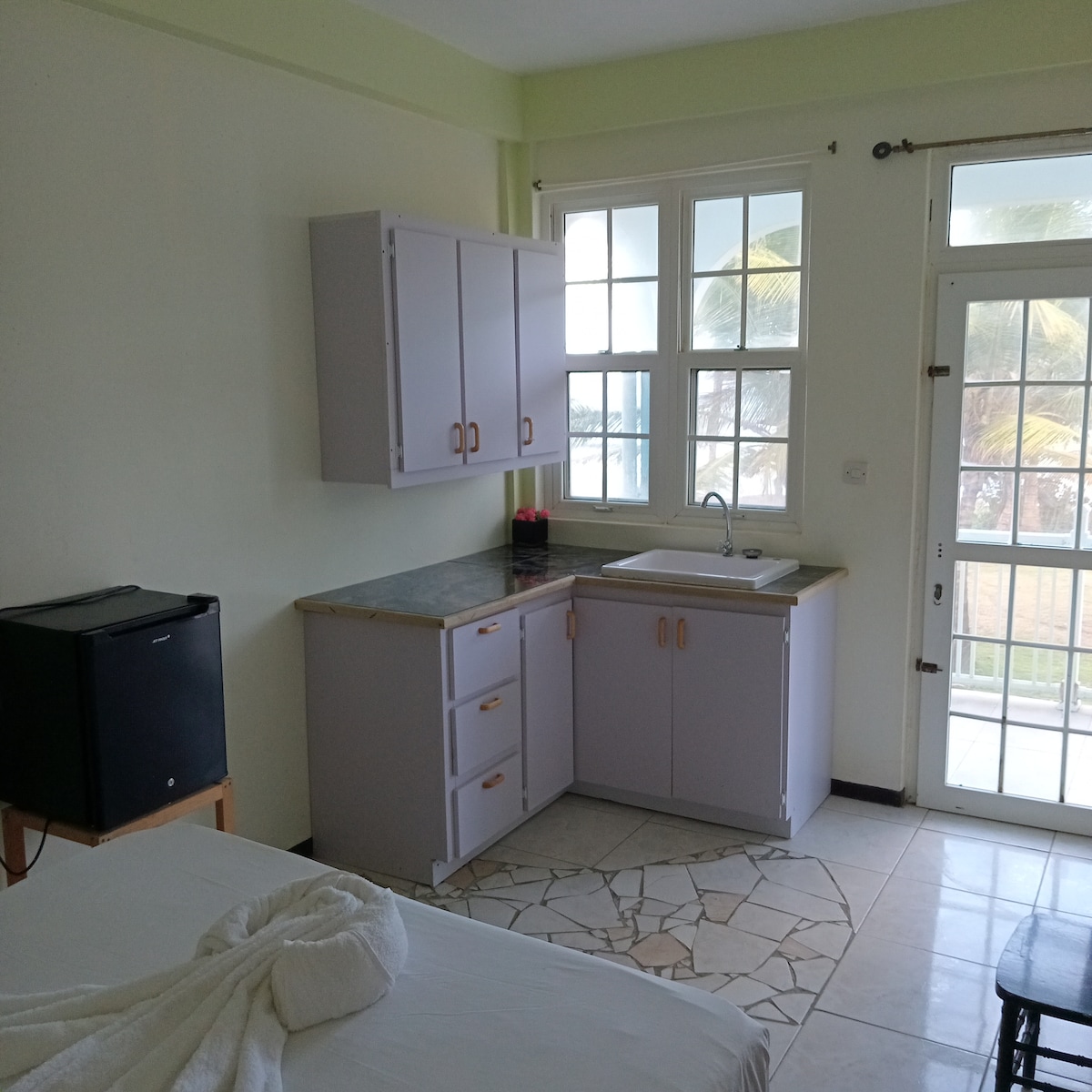 Nestled in the touristic Kalinago community, Sapphire Studio overlooks the Jolly John's memorial park and within walking distance to the scenic Kalinago Barana Aute (Kalinago village by the sea) and the Tilou Kanawa Restaurant & Souvenir Shop. With its picturesque ocean views and Kalinago-inspired aesthetic, this cozy one-bedroom caters to a peaceful sanctuary with a fusion of modern and Kalinago home design. Whether you are visiting for short or long-term, indulge in modern Kalinago bliss.
