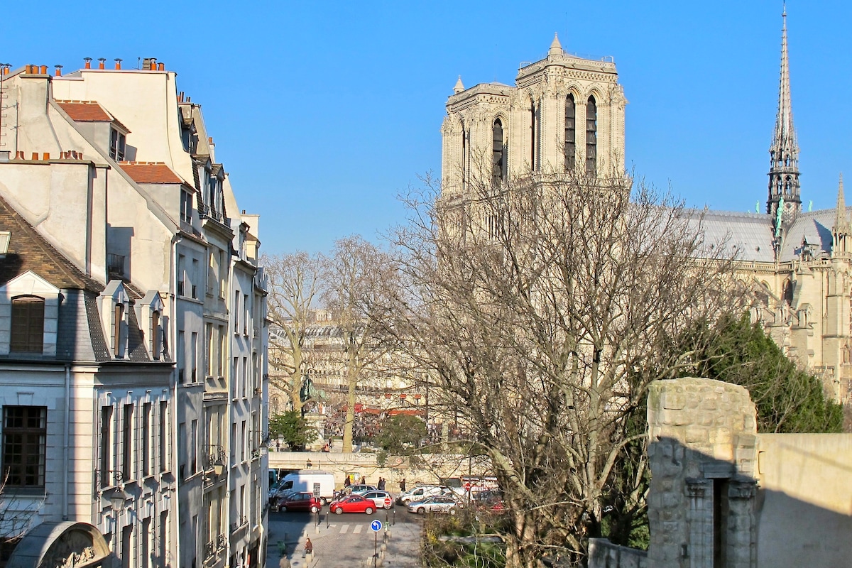 Yes, this is exactly the view from your window. In your Parisian home, Abelard. Look over the Seine and the rooftops, the sun is fading behind Notre Dame and the sky turns 50 shades of red, you will not want to leave. To get to your 1 BDR on 2nd floor, there are 12 steps all together to climb and an elevator, a rarity in an historical 400 years old building in the very heart of the city. Paris is all yours !