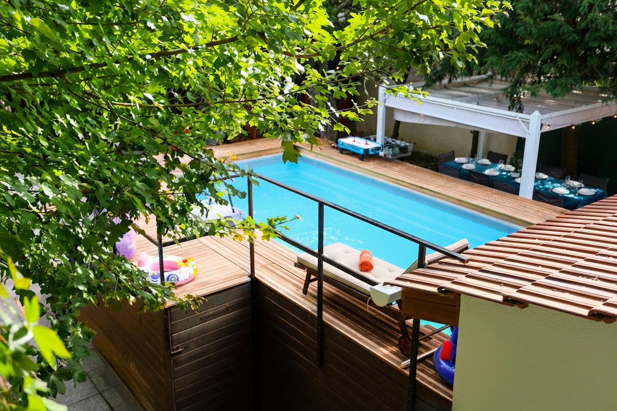 This unique, modern, and fully equipped house boasts its own distinct style. Located just a ten-minute walk from the metro, offering easy access to Paris (15 mins), Orly airport (20 mins), and Disneyland (30 mins). With 2 bedrooms, kitchen, living room, dining area, and 2 bathrooms, it's perfect for a comfortable stay. Additional amenities include AC, Wifi/Netflix, Coffee/Tea. For unforgettable moments, enjoy the outdoor jacuzzi spa, BBQ, and a beautiful terrace surrounded by greenery.