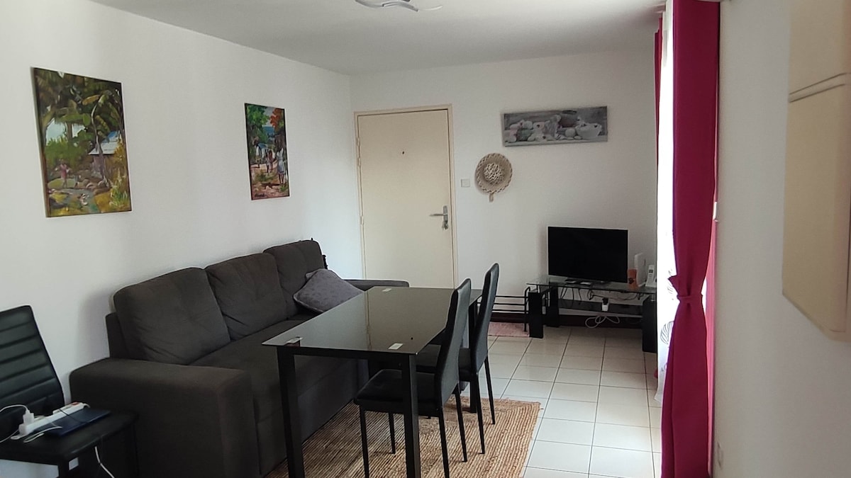 A 10 minutes de l aéroport, proche de tout commerce. Joli T2 de 40 m2 +varangue et parking en sous-sol dans résidence calme et sécurisée. Clim, télévision connectée wifi et Netflix , bonne literie et électroménager neuf. Mise en contact pour location de voiture possible.