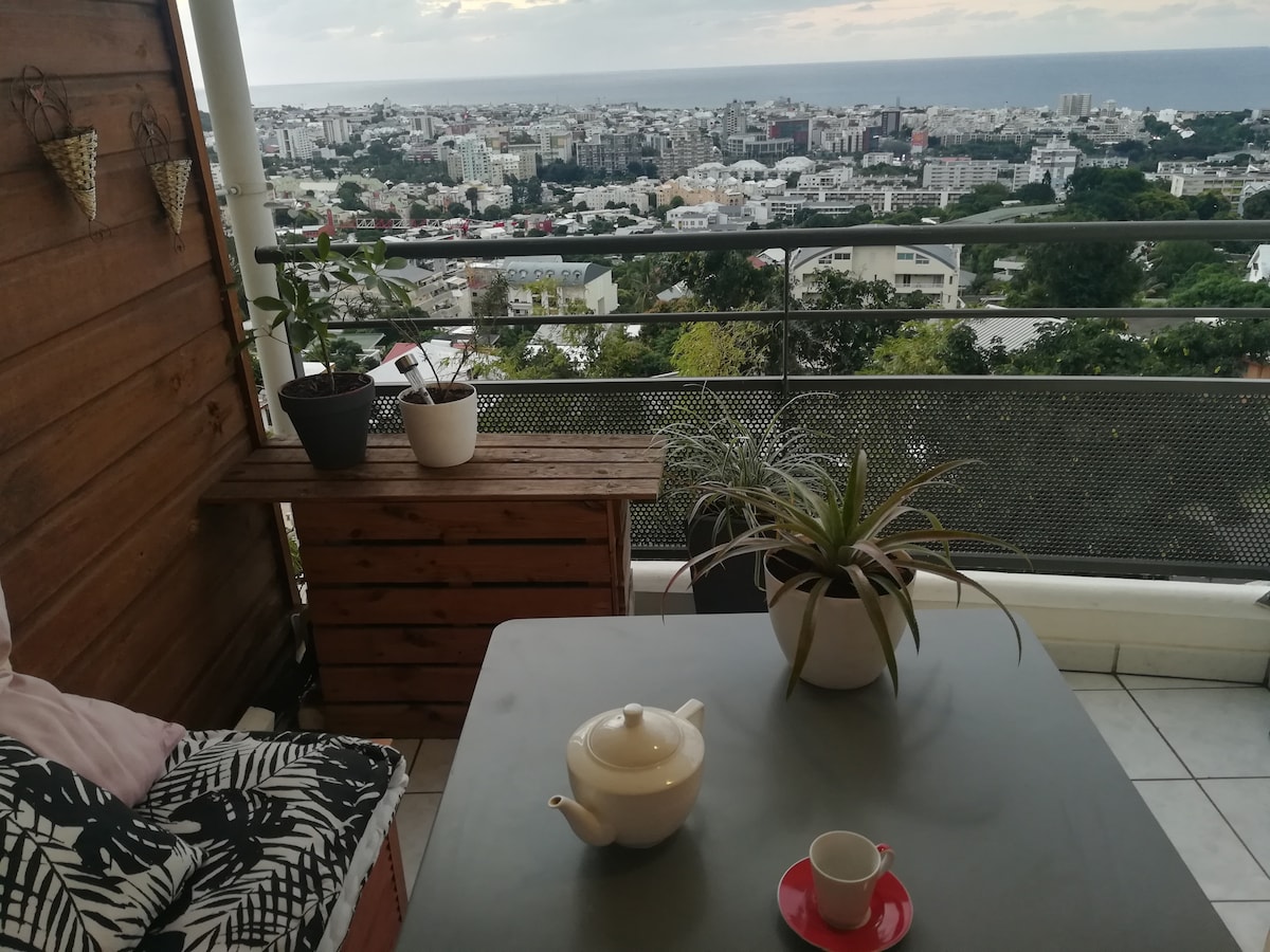Situé en surplomb de la ville de St Denis, à 15 min en voiture de l'aéroport, 3 min à pieds du terminus du téléphérique, cet appartement cozy (T2 de 40m² + 12m² d'extérieur) sera votre point de départ idéal pour partir à la découverte de l'île. Montez les quelques virages pour rejoindre l'appartement et venez profiter de sa terrasse confortable ainsi que de sa magnifique vue panoramique sur l'océan. Des vacances comme si vous étiez vraiment chez vous mais au bout du monde !