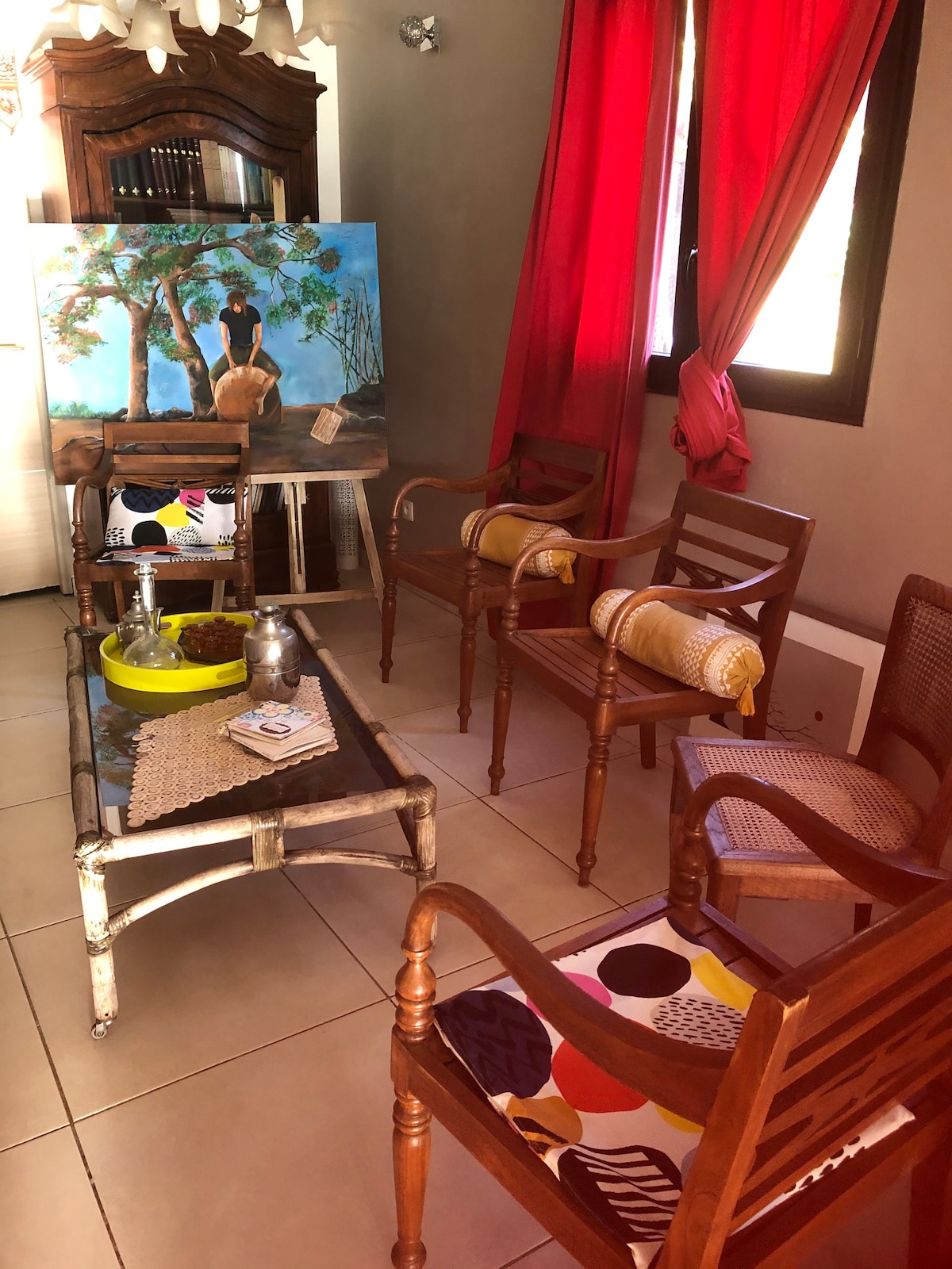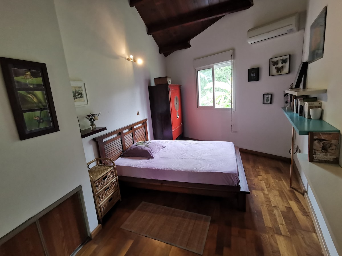 Villa d' Architecte , dans lotissement privée, sécurisé , à 20 minutes de Saint Denis. Grand jardin arboré, terrasse avec vue sur nature. Calme assuré. 1 chambre 25 M2 + salle de bain attenante privée +bureau WiFi privé. Ensemble adapté au télé travail dans un cadre serein. accès aux grands espaces communs. frigo privatif. Parking . Arrêt bus à 100M.