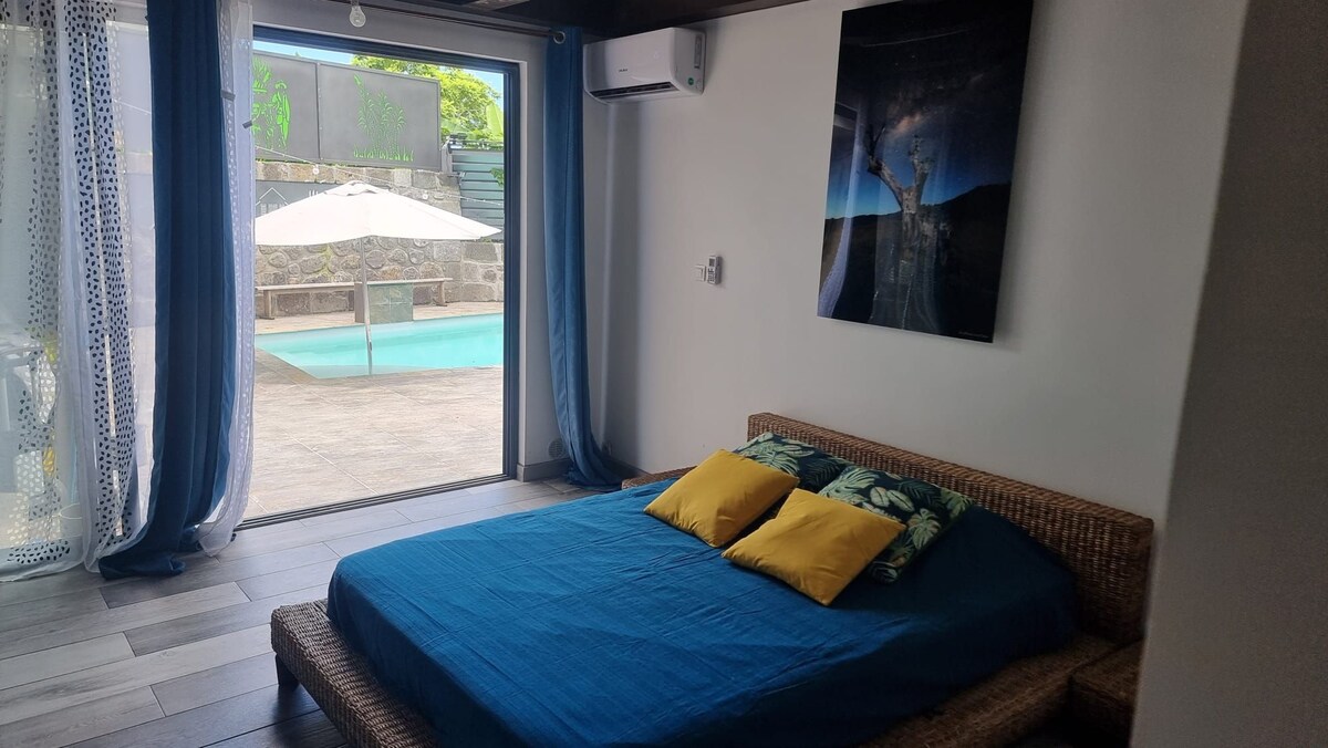 Studio sur deux étages. Au rez de chaussée salon / salle à manger et la salle de bain. Vous trouverez à l'extérieur une cuisine aménagée avec le lave linge à disposition. A l'étage, une grande chambre à coucher climatisée avec des rangements et un bureau. Le lit format king size est équipé d'une moustiquaire. Le tout dans un grand jardin arboré avec piscine. Nous sommes à 5 min de l'aéroport. (Pour les transferts nous demander par message) Nous vous attendons !