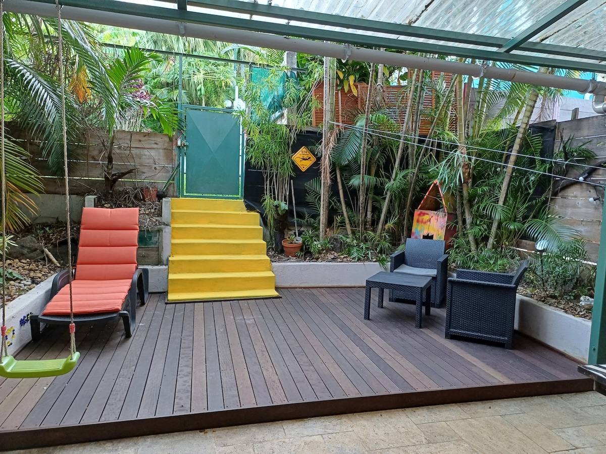 proche toutes commodités ,5 mn aéroport , réseau bus ,taxi, location de voiture, marché forain, piscine municipale, centre commercial, La Poste, boulangerie ,banque .. à proximité du sentier littoral de St Denis à Ste Suzanne 10 mn centre ville St Denis, à 2 km à pied de la NORDEV. à 1km station téléphérique parking privé. Non accessible aux personnes à mobilité réduite (couchage en mezzanine et cabine de douche)