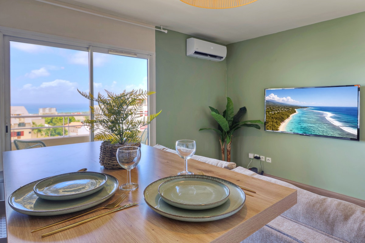 Magnifique appartement de typeT2, lumineux et climatisé, est prolongé d'une terrasse pour déjeuner, travailler, rêver face à la ville et à l'océan indien ou se reposer sur les transats vis à vis de l'horizon marin. Il est desservi par une impasse privée avec un parking sécurisé et couvert. Simplifiez-vous la vie dans ce logement paisible et central.