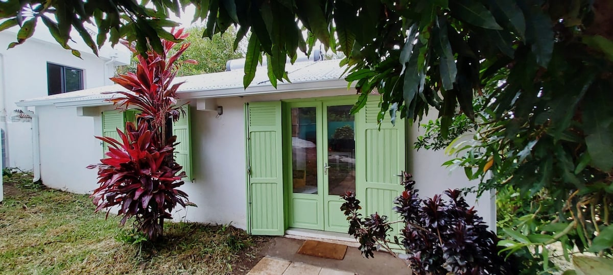 Bungalow cosy en bois avec terrasse privée, idéal pour 2 voyageurs, à seulement 5 min de l’aéroport. Profitez d’un cadre tropical calme avec piscine naturelle, parfait pour se détendre après un vol ou explorer le Nord et l’Est de l’île. - Chambre climatisée - Cuisine équipée - Salle de bain privative - Wi-Fi haut débit Arrivée autonome. Stationnement gratuit. Après réservation, personnalisez votre séjour : transfert aéroport, arrivée anticipée, départ tardif, petit-déjeuner.
