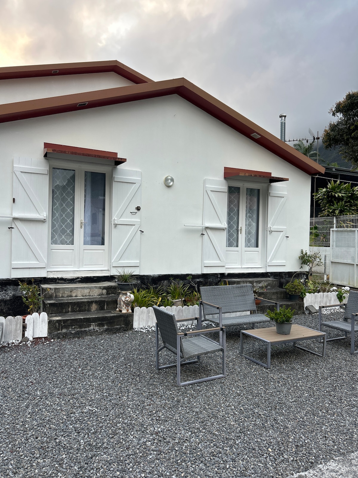 I offer a quiet and inspiring place for those seeking peace and rest in an authentic and joyful setting, just 15 minutes from St Denis. We are located at 600 meters altitude with a breathtaking view, a large garden, and the most beautiful sunsets on the island. In the garden, you have your own chalet (60m²) with air conditioning, a separate entrance, a private bathroom, a microwave, and a fridge. A vegan breakfast on the veranda with a view is included.