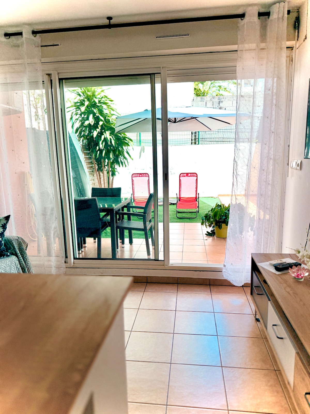 Studio de standing avec décor raffiné, tout confort, situé au rez de jardin d'une villa avec piscine. Grande terrasse avec coin repas et chaises longues donnant sur un beau jardin, vue sur le champ de cannes et la mer. Accès indépendant. Situé à 7 min de l'aéroport avec plusieurs sites touristiques à proximité (La Vanilleraie, Le Phare, La sucrerie de Bois Rouge, Cascade Niagara, nombreux bassins , etc). Localisation idéale pour visiter le nord, le cirque de Salazie et la côte Est.