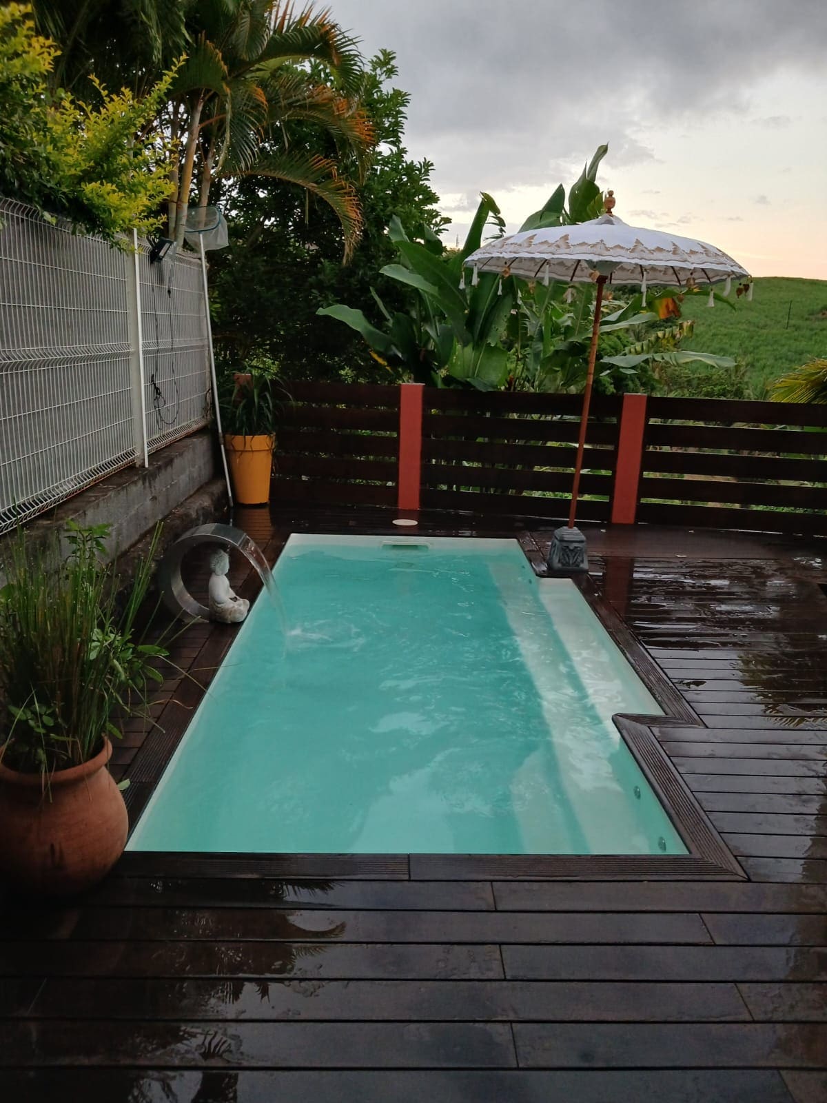 Studio de 21 m² environ a l'étage 12 marches, dans la maison du propriétaire, un parking gratuit fermer a clef et éclairer la nuit, une varangue vous attend avec un barbecue pour les grillades, table et 2 chaises, si vous fumer , un cendrier vous est fourni seulement a cette endroit . Selon saison le bananier, manguier, le cotonnier, le papayer et bien sur la piscine toute l'année t° 23 minimum l' hiver et 32° l été, Nous vous laissons la priorité a la piscine .