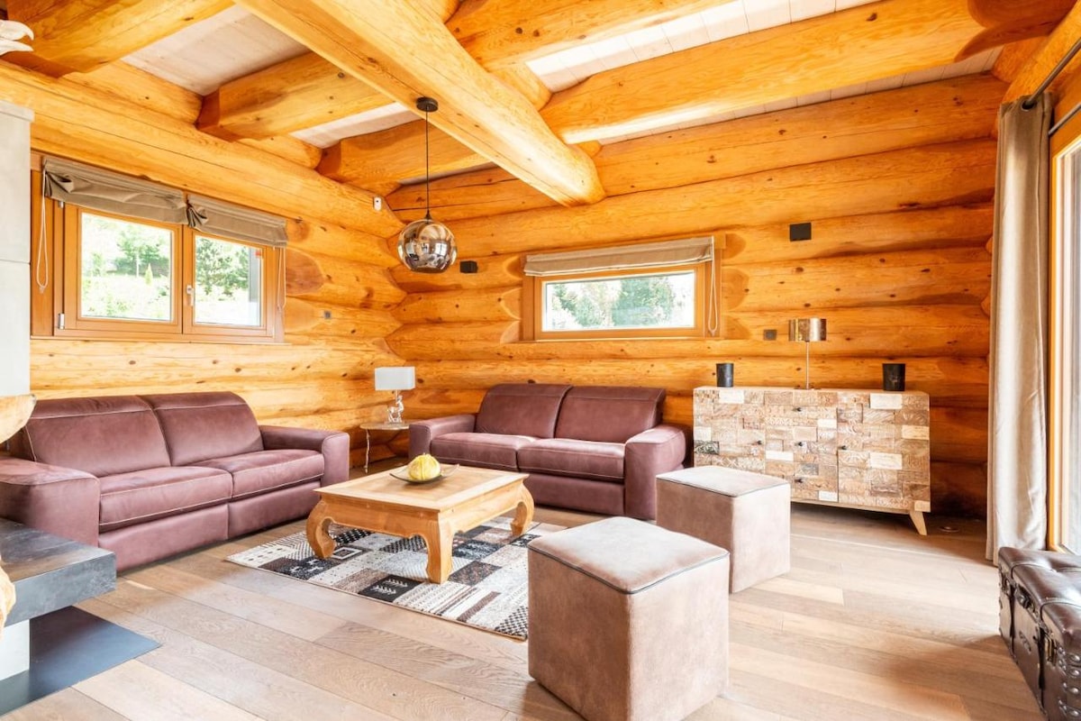Joli chalet insolite, rustique et contemporain de 170m2. SPA et WIFI. Capacité de 10 pers., maxi 12. 5 ch. avec chacune au choix : 1 lit de 180/200 ou 2 lit de 90/200. 3 sdb, 4 WC, Salle à manger, salon, cuisine toute équipée, Salle de repos avec billard. 2 grande terrasses dont une avec spa 7 places. Un poêle a bois. Sol chauffant ou rafraichissant dans toute la maison. Télévision dans les chambres et au salon. Compris : linge de lits (draps), bois pour le poêle... Cadeau de bienvenue