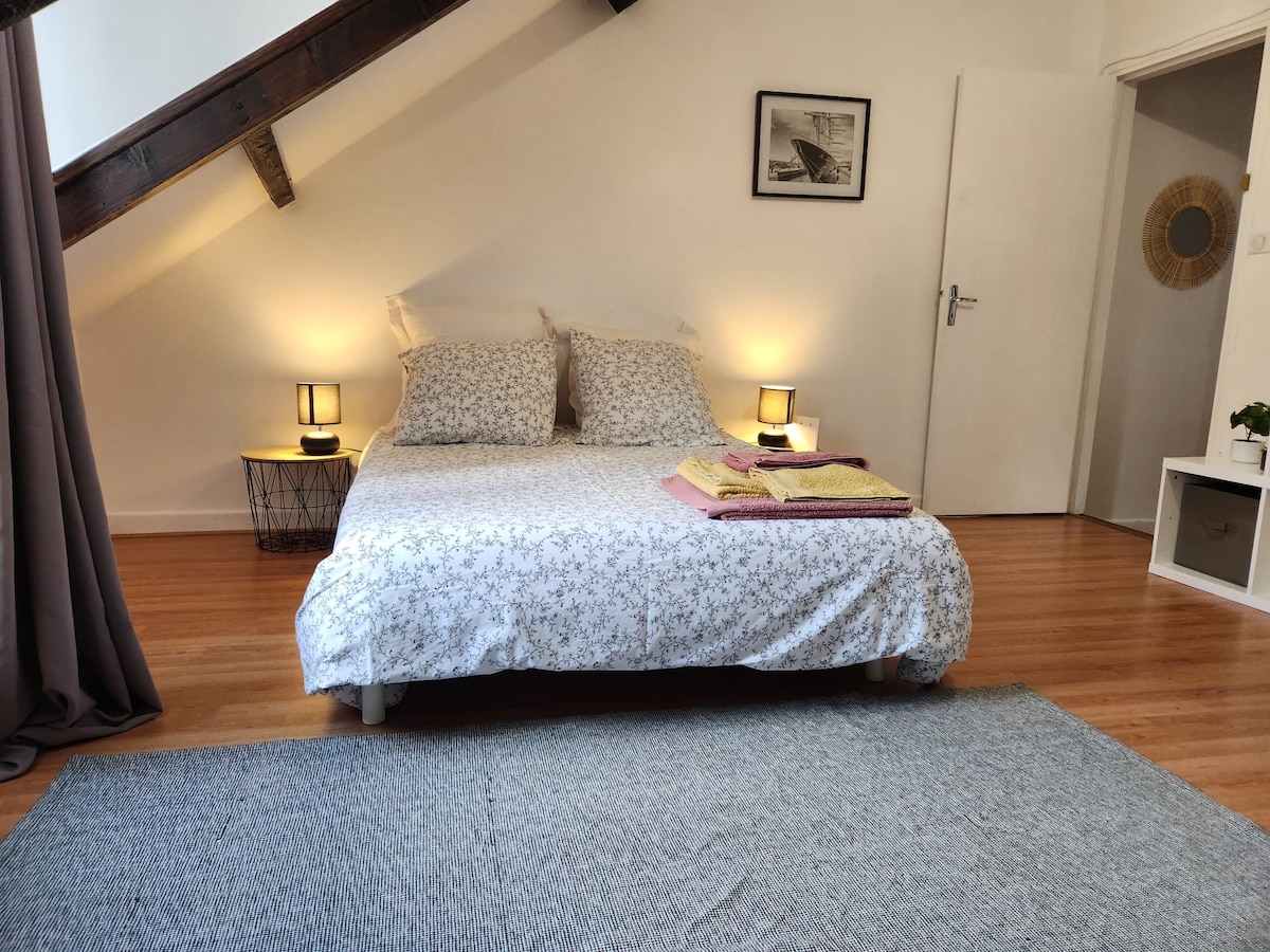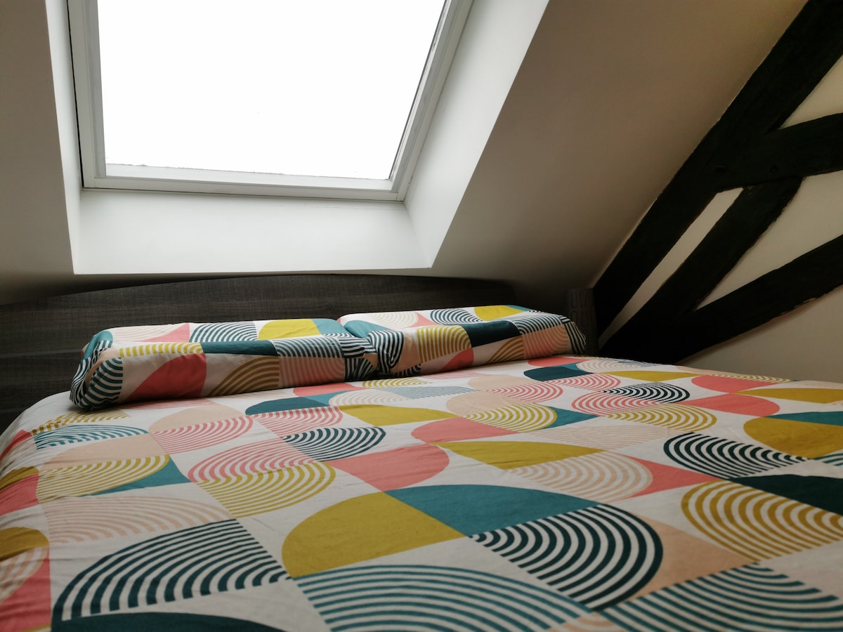 Appartement à colombages idéalement situé au pied de la cathédrale quartier historique et touristique proche de nombreux commerces,parking gratuit à 5min à pied. Logement de 45m2 une chambre avec lit 180/200 , pièce de vie ,cuisine équipée,tv,wifi et patio extérieur