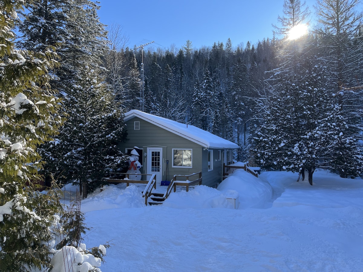 Small moderne warm Cottage! Come relax, unwind and fully rest! Be surrounded by several pine trees. This cottage can greet 2-4 adults (+1 child). You have WiFi and electric fireplace. Its time to disconnect from your daily life with its SPA as well as an outdoor GAZÉBO to fully enjoy it while watching the beautiful views of the mountains! Fishers, snowmobilers and ATV’s its the ideal place for nature lovers. Motorcyclers you will enjoy the road! Access to the river is a 5 min walk! Book Now